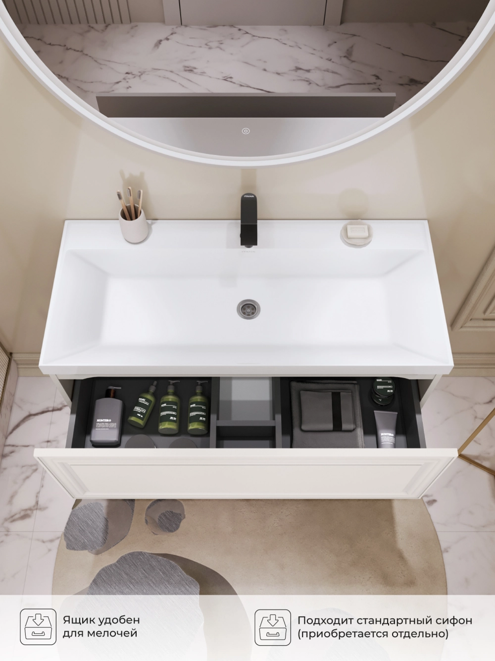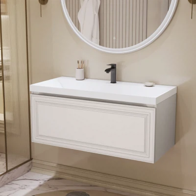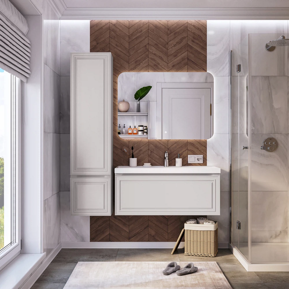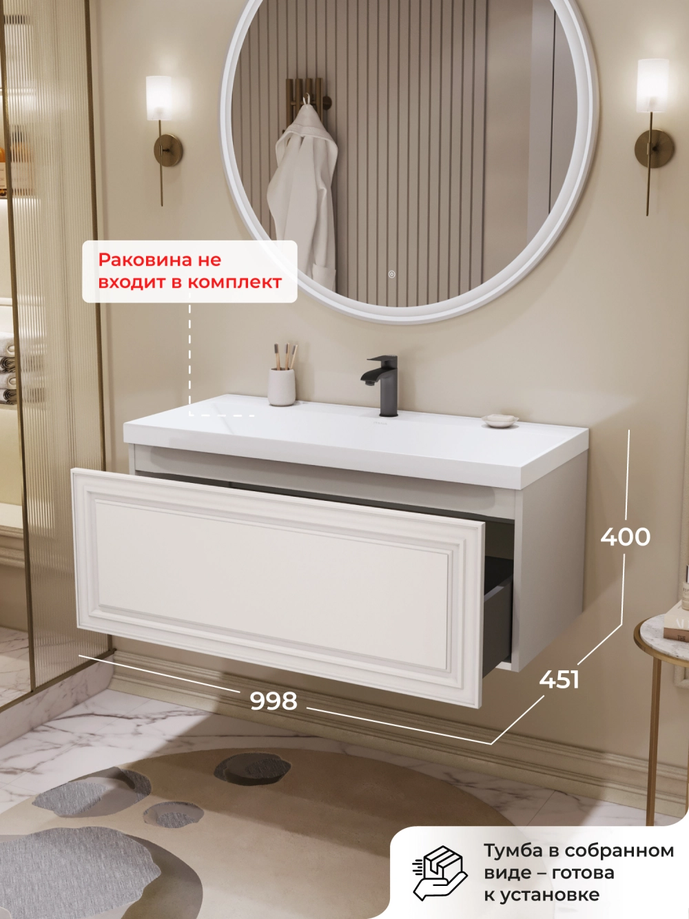 Подвесная тумба под раковину из коллекции Verona станет настоящим украшением ванной комнаты в современном скандинавском стиле. Навесной способ установки тумбы в ванную дает возможность не только визуально увеличить пространство, но и обеспечивает быстрый и удобный доступ для уборки. Размеры подвесной тумбы под раковину 998х451х400 - идеальный выбор для ванной комнаты или туалета. Тумба для ванны изготовлена из прочного МДФ, поэтому выдерживает высокие эксплуатационные нагрузки. Качественная фурнитура с доводчиками обеспечивает легкое открывание и плавное закрывание ящика. Вырез под сифон универсальный, для любого типа. Благодаря своей конструкции тумба в ванную обеспечивает удобный доступ к раковине и позволяет скрыть коммуникации. Тумба по раковину в ванную оснащена удобным ящиком для хранения, что позволяет разместить всё необходимое под рукой. Ручки интегрированы в фасад дверки шкафчика, что исключает возможность случайного удара о фурнитуру. Для точного выбора подвесной тумбы под раковину в ванную комнату рекомендуем обратиться к схеме замеров, которая находится на фото в карточке товара, размеры изделия могут отличаться +/-1 см в связи со спецификой производства. Тумба для ванной доставляется в предварительно собранном виде, надежно упакована.