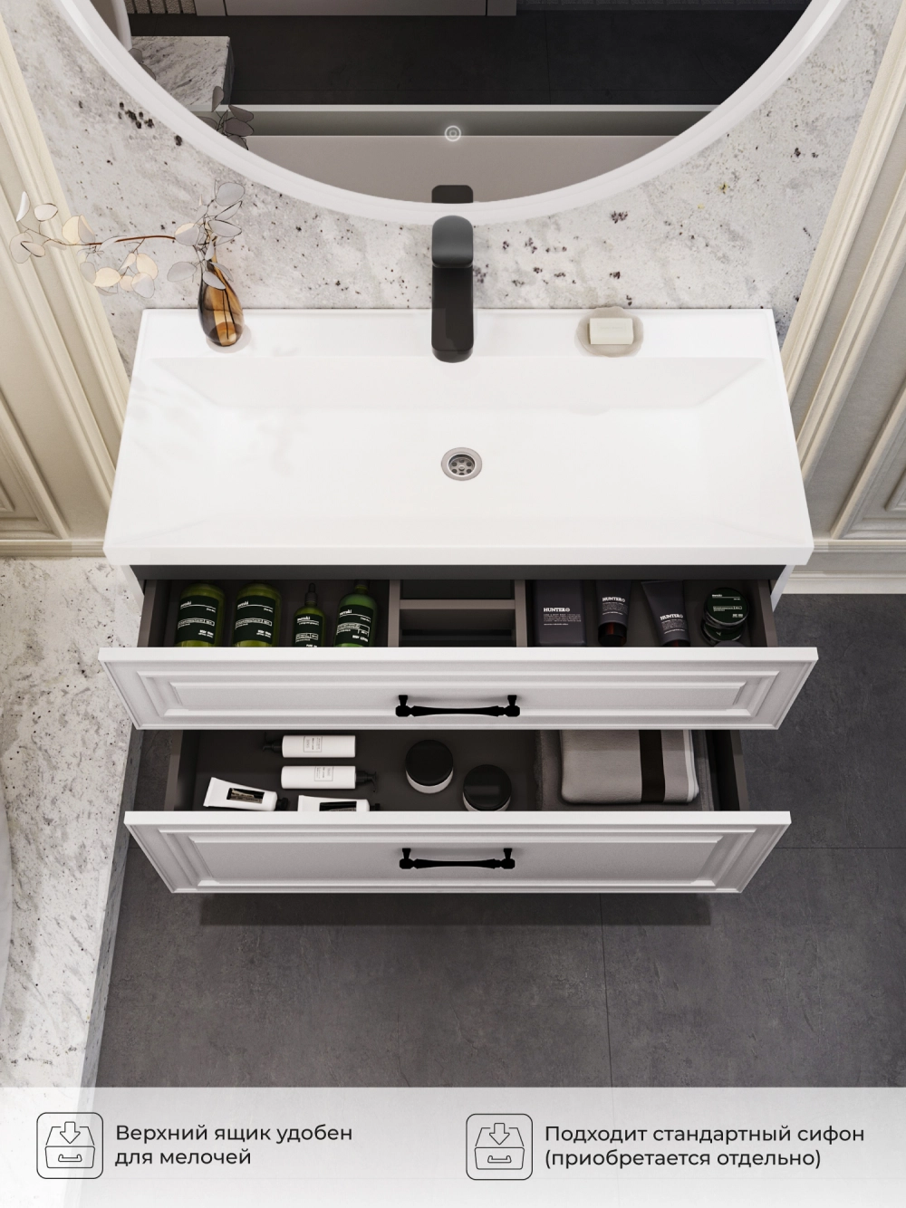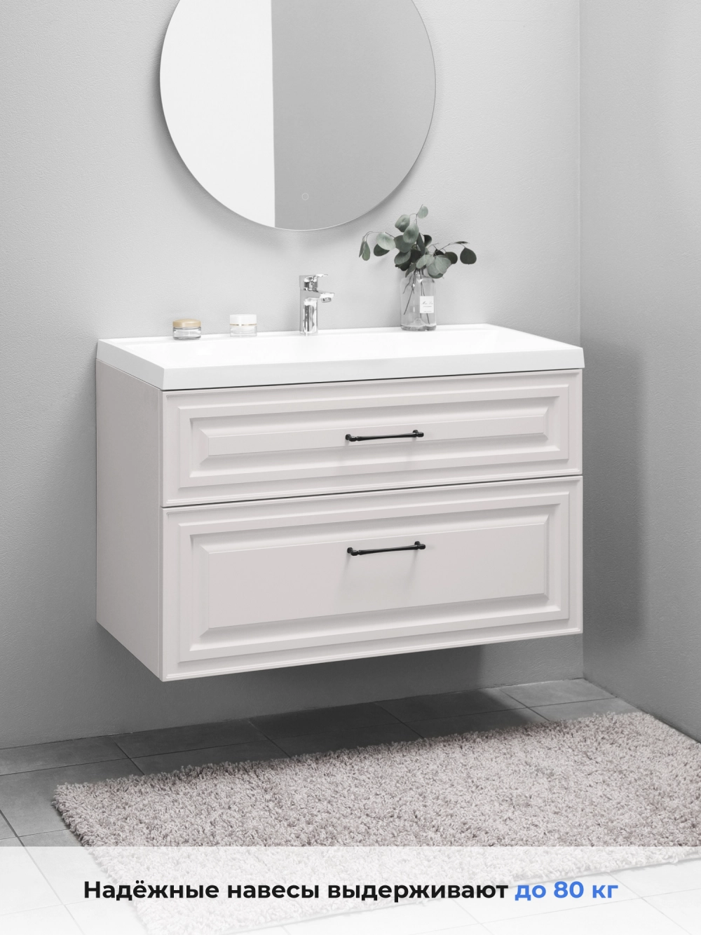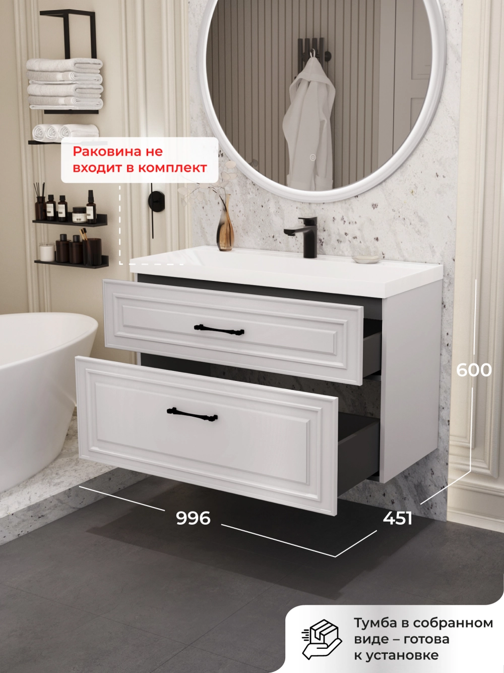 Подвесная тумба под раковину из коллекции Verona станет настоящим украшением ванной комнаты в современном скандинавском стиле. Навесной способ установки тумбы в ванную дает возможность не только визуально увеличить пространство, но и обеспечивает быстрый и удобный доступ для уборки. Размеры подвесной тумбы под раковину 996х451х600 - идеальный выбор для ванной комнаты или туалета. Тумба для ванны изготовлена из прочного МДФ, поэтому выдерживает высокие эксплуатационные нагрузки. Качественная фурнитура с доводчиками обеспечивает легкое открывание и плавное закрывание ящика. Вырез под сифон универсальный, для любого типа. Благодаря своей конструкции тумба в ванную обеспечивает удобный доступ к раковине и позволяет скрыть коммуникации. Тумба под раковину в ванную оснащена удобным ящиком для хранения, что позволяет разместить всё необходимое под рукой. Ручки интегрированы в фасад дверки шкафчика, что исключает возможность случайного удара о фурнитуру. Для точного выбора подвесной тумбы под раковину в ванную комнату рекомендуем обратиться к схеме замеров, которая находится на фото в карточке товара, размеры изделия могут отличаться +/-1 см в связи со спецификой производства. Тумба для ванной доставляется в предварительно собранном виде, надежно упакована.