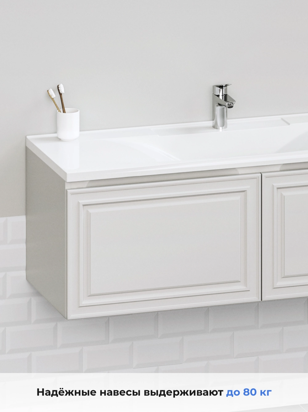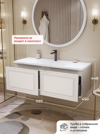 Подвесная тумба под раковину из коллекции Verona станет настоящим украшением ванной комнаты в современном скандинавском стиле. Навесной способ установки тумбы в ванную дает возможность не только визуально увеличить пространство, но и обеспечивает быстрый и удобный доступ для уборки. Размеры подвесной тумбы под раковину 1193х450х400 - идеальный выбор для ванной комнаты или туалета. Тумба для ванны изготовлена из прочного МДФ, поэтому выдерживает высокие эксплуатационные нагрузки. Качественная фурнитура с доводчиками обеспечивает легкое открывание и плавное закрывание ящика. Вырез под сифон универсальный, для любого типа. Благодаря своей конструкции тумба в ванную обеспечивает удобный доступ к раковине и позволяет скрыть коммуникации. Тумба под раковину в ванную оснащена удобным ящиком для хранения, что позволяет разместить всё необходимое под рукой. Ручки интегрированы в фасад дверки шкафчика, что исключает возможность случайного удара о фурнитуру. Для точного выбора подвесной тумбы под раковну в ванную комнату рекомендуем обратиться к схеме замеров, которая находится на фото в карточке товара, размеры изделия могут отличаться +/-1 см в связи со спецификой производства. Тумба для ванной доставляется в предварительно собранном виде, надежно упакована.