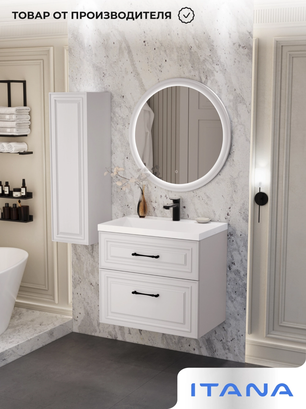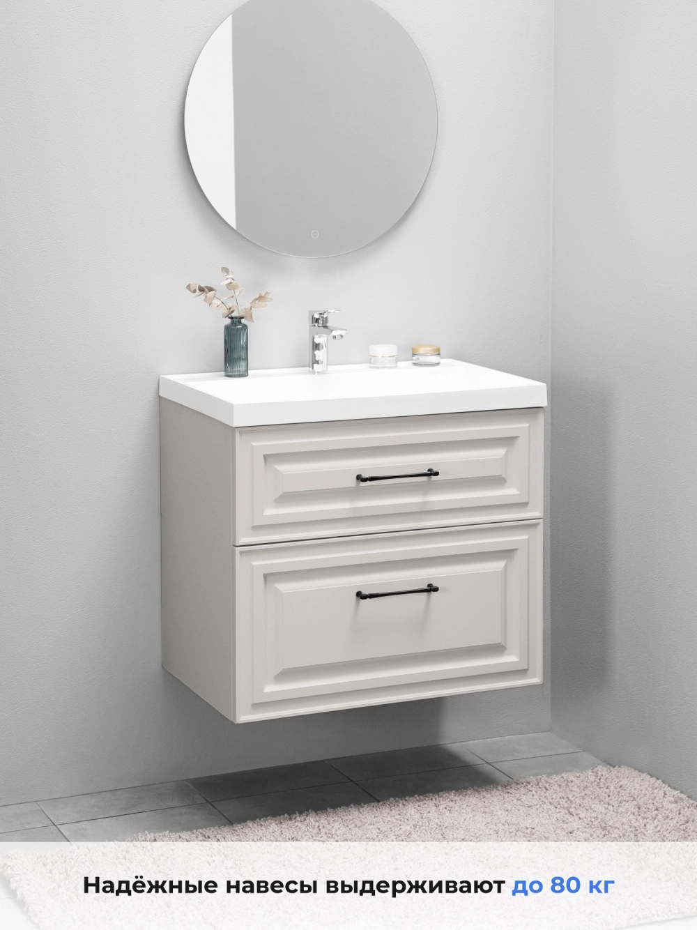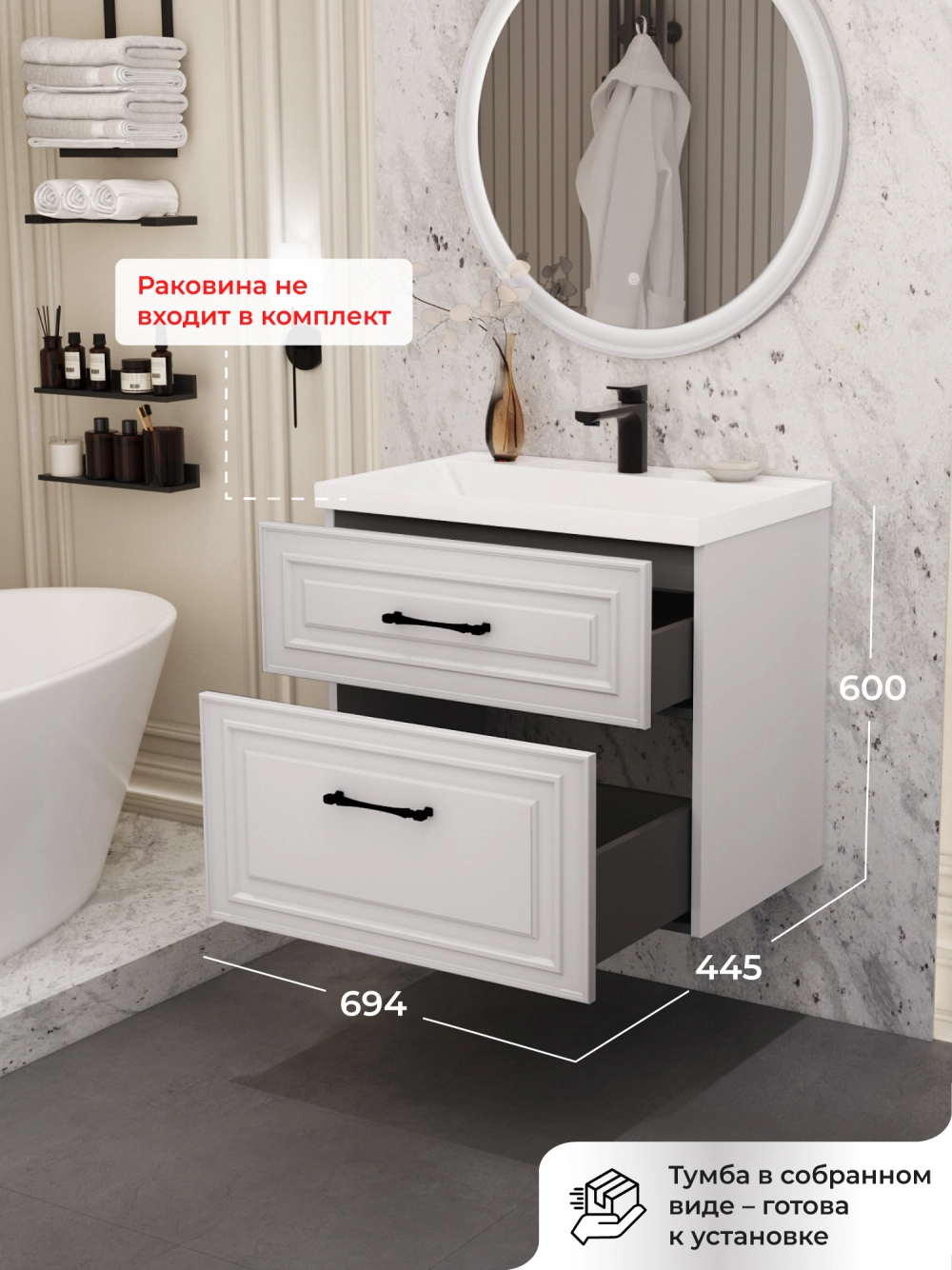 Подвесная тумба под раковину из коллекции Verona станет настоящим украшением ванной комнаты в современном скандинавском стиле. Навесной способ установки тумбы в ванную дает возможность не только визуально увеличить пространство, но и обеспечивает быстрый и удобный доступ для уборки. Размеры подвесной тумбы под раковину 694х445х600 - идеальный выбор для ванной комнаты или туалета. Тумба для ванны изготовлена из прочного МДФ, поэтому выдерживает высокие эксплуатационные нагрузки. Корпус и фасады тумбы для ванной покрыты матовой пленкой, что обеспечивает дополнительную защиту тумбы под раковину от влаги и перепадов температуры. Качественная фурнитура с доводчиками обеспечивает легкое открывание и плавное закрывание ящика. Вырез под сифон универсальный, для любого типа. Благодаря своей конструкции тумба в ванную обеспечивает удобный доступ к раковине и позволяет скрыть коммуникации. Тумба под раковину в ванную оснащена удобным ящиком для хранения, что позволяет разместить всё необходимое под рукой. Ручки интегрированы в фасад дверки шкафчика, что исключает возможность случайного удара о фурнитуру. Для точного выбора подвесной тумбы под раковину в ванную комнату рекомендуем обратиться к схеме замеров, которая находится на фото в карточке товара, размеры изделия могут отличаться +/-1 см в связи со спецификой производства. Тумба для ванной доставляется в предварительно собранном виде, надежно упакована.