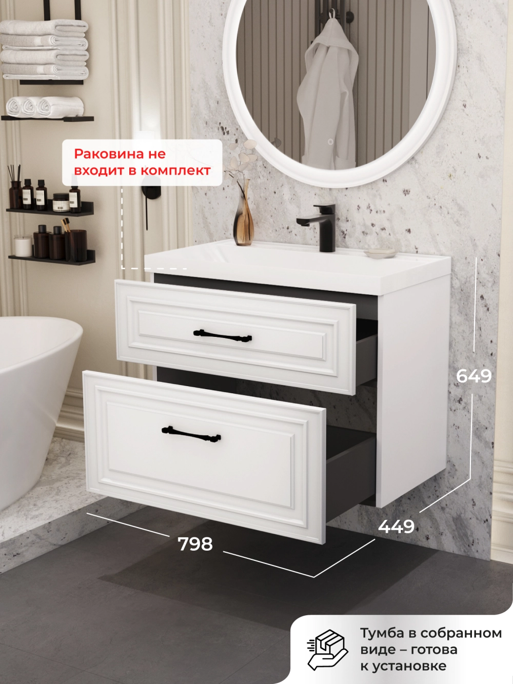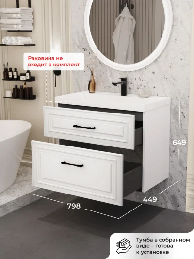 Подвесная тумба под раковину из коллекции Verona станет настоящим украшением ванной комнаты в современном скандинавском стиле. Навесной способ установки тумбы в ванную дает возможность не только визуально увеличить пространство, но и обеспечивает быстрый и удобный доступ для уборки. Размеры подвесной тумбы под раковину 792х446х600 - идеальный выбор для ванной комнаты или туалета. Тумба для ванны изготовлена из прочного МДФ, поэтому выдерживает высокие эксплуатационные нагрузки и обеспечивает дополнительную защиту тумбы с раковиной от влаги и перепадов температуры. Качественная фурнитура с доводчиками обеспечивает легкое открывание и плавное закрывание ящика. Вырез под сифон универсальный, для любого типа. Благодаря своей конструкции тумба в ванную обеспечивает удобный доступ к раковине и позволяет скрыть коммуникации. Тумба под раковину в ванную оснащена удобным ящиком для хранения, что позволяет разместить всё необходимое под рукой. Ручки интегрированы в фасад дверки шкафчика, что исключает возможность случайного удара о фурнитуру. Для точного выбора подвесной тумбы под раковину в ванную комнату рекомендуем обратиться к схеме замеров, которая находится на фото в карточке товара, размеры изделия могут отличаться +/-1 см в связи со спецификой производства. Тумба для ванной доставляется в предварительно собранном виде, надежно упакована.