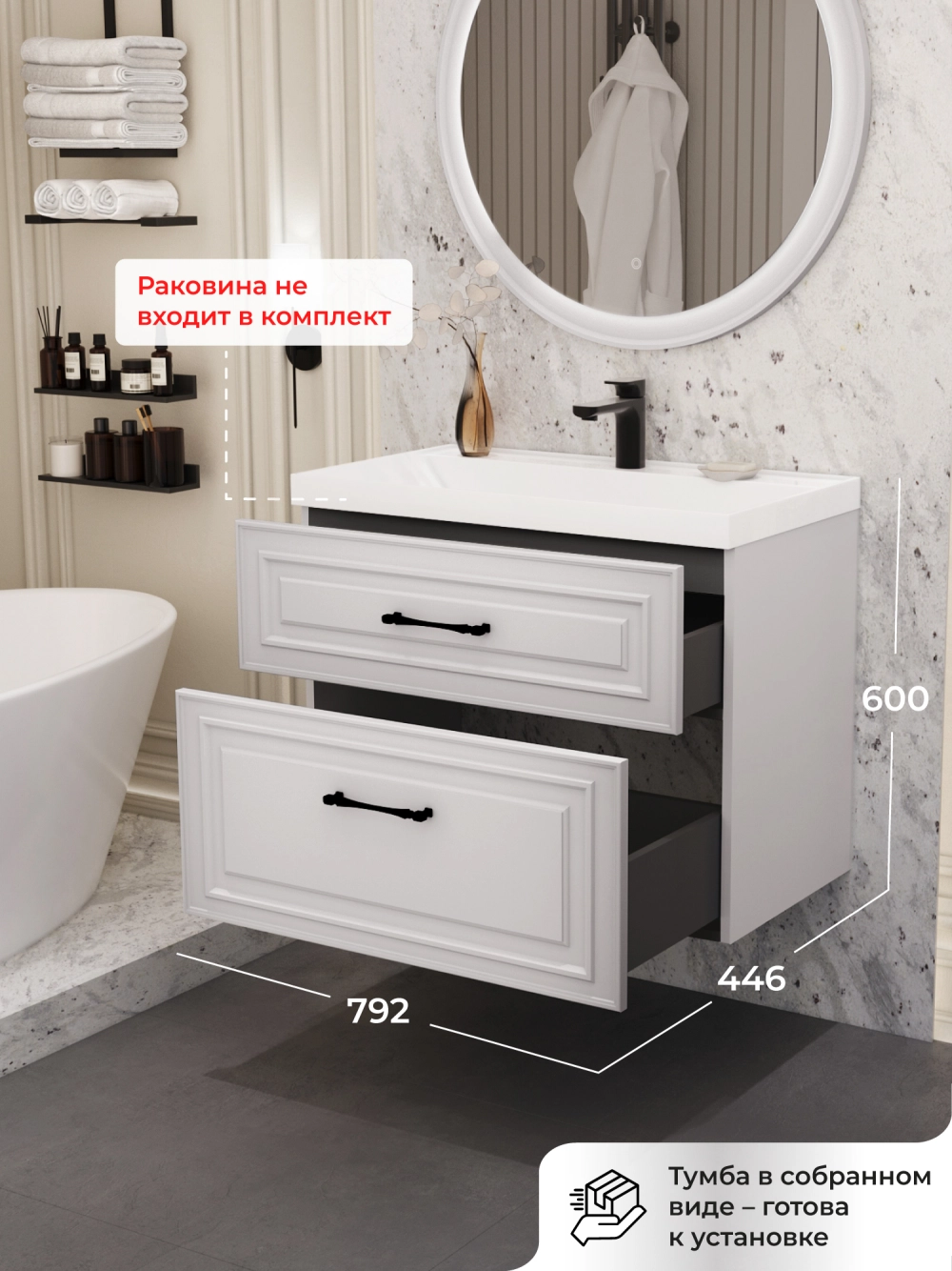 Подвесная тумба под раковину из коллекции Verona станет настоящим украшением ванной комнаты в современном скандинавском стиле. Навесной способ установки тумбы в ванную дает возможность не только визуально увеличить пространство, но и обеспечивает быстрый и удобный доступ для уборки. Размеры подвесной тумбы под раковину 792х446х600 - идеальный выбор для ванной комнаты или туалета. Тумба для ванны изготовлена из прочного МДФ, поэтому выдерживает высокие эксплуатационные нагрузки и обеспечивает дополнительную защиту тумбы под раковину от влаги и перепадов температуры. Качественная фурнитура с доводчиками обеспечивает легкое открывание и плавное закрывание ящика. Вырез под сифон универсальный, для любого типа. Благодаря своей конструкции тумба в ванную обеспечивает удобный доступ к раковине и позволяет скрыть коммуникации. Тумба под раковину в ванную оснащена удобным ящиком для хранения, что позволяет разместить всё необходимое под рукой. Ручки интегрированы в фасад дверки шкафчика, что исключает возможность случайного удара о фурнитуру. Для точного выбора подвесной тумбы под раковину в ванную комнату рекомендуем обратиться к схеме замеров, которая находится на фото в карточке товара, размеры изделия могут отличаться +/-1 см в связи со спецификой производства. Тумба для ванной доставляется в предварительно собранном виде, надежно упакована.