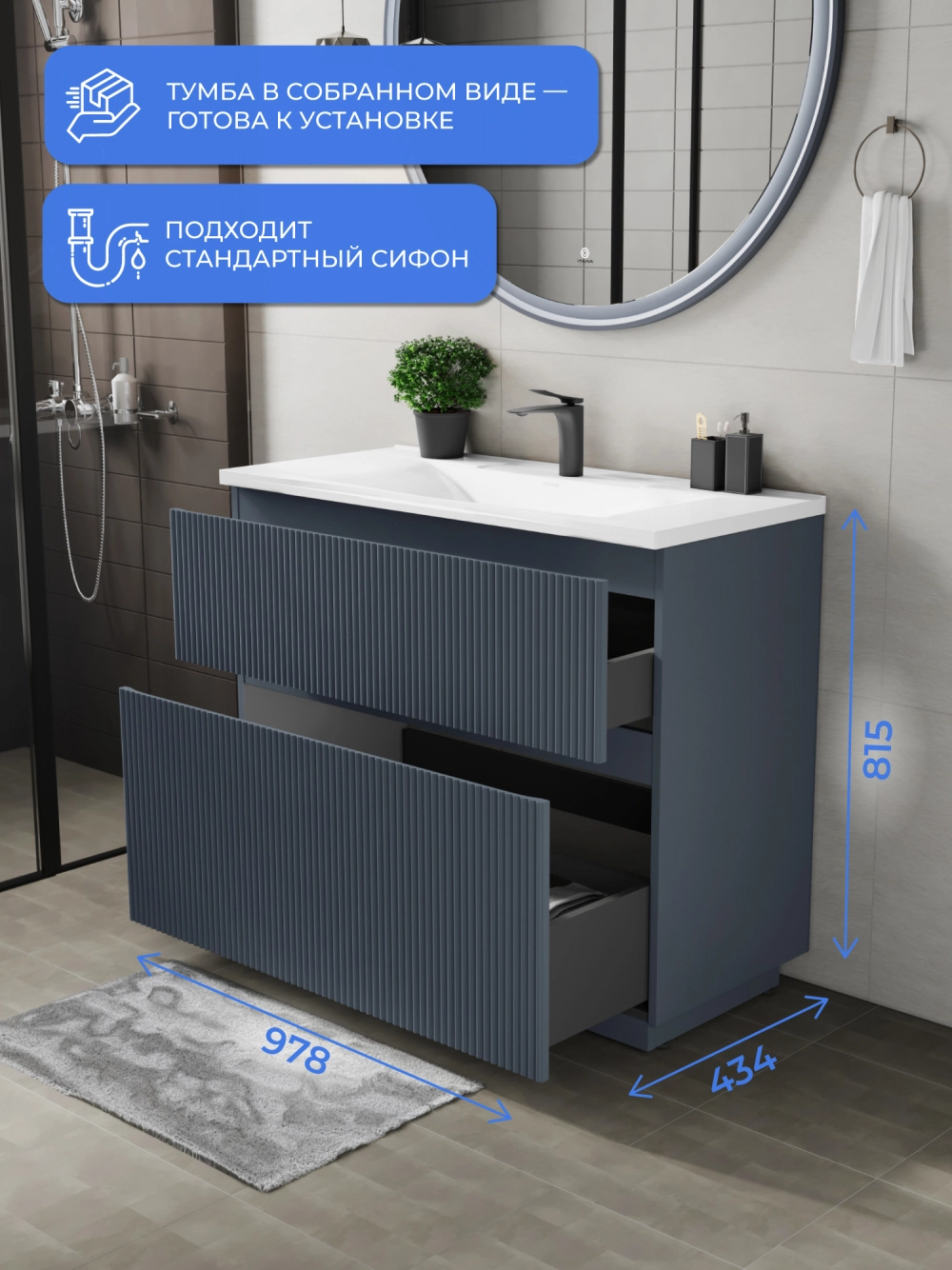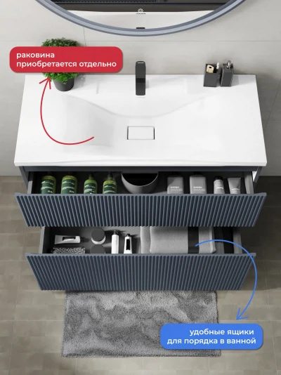 Напольная тумба под раковину Итана Kate станет идеальным дополнением для вашей ванной комнаты, сочетая в себе стильный дизайн и функциональность. Коллекция Kate - воплотила в себе тренд на фактурные фасады. Идеальный "рубчик" - простое и стильное дизайнерское решение для декорирования фасадов - эта мебель бесспорно станет украшением современной ванной комнаты. Тумба изготовлена из высококачественных материалов, гарантируя долговечность и надежность эксплуатации. Удобные фрезерованные ручки, качественная фурнитура с доводчиками, вместительность - мы продумали все, чтобы тумба была не просто красивой, но еще и функциональной, приятной в использовании. Ее конструкция позволяет легко поддерживать порядок в ванной, ведь все мелочи будут аккуратно убраны. Стильный декор тумбы добавляет изюминку в общий дизайн, вписываясь в современные и классические интерьеры. Удобные выдвижные ящики обеспечивают простоту доступа к содержимому тумбы.