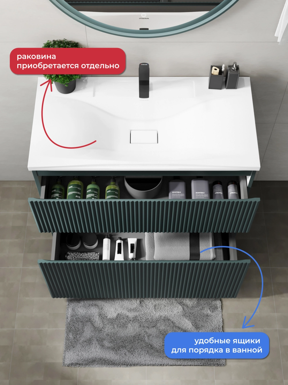Тумба под раковину в ванную от известного бренда ITANA станет отличным дополнением к вашему интерьеру. Эта модель имеет современный дизайн и выполнена из высококачественного материала - МДФ. Она обладает пленочным покрытием, которое обеспечивает долгий срок службы и защиту от царапин и повреждений.<br>Тумба под раковину имеет выдвижные ящики, что делает ее удобной для хранения различных вещей. Тумба под раковину имеет современный стиль дизайна и выполнена в зеленом цвете Веллюто Авокадо. Она является отличным дополнением к любому интерьеру и прослужит вам долгое время.