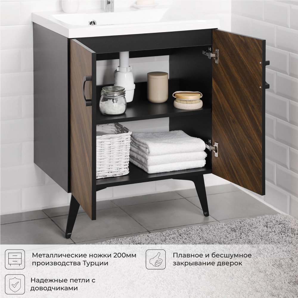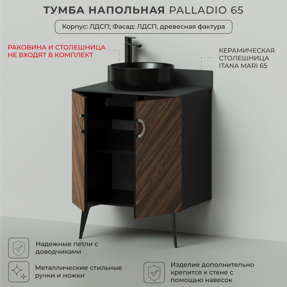 Напольная тумба под раковину из коллекции Palladio выполнена в модных декорах. Технология производства позволила сделать элементы мебели устойчивыми к влаге. Качественная фурнитура с доводчиками обеспечивает легкое открывание и плавное закрывание дверей. Дизайнерские металлические ручки с покрытием не только декоративный элемент, но и удобное решение - фасады остаются чистыми при постоянном открывании и закрывании. Вырез под сифон универсальный, для любого типа. Благодаря своей конструкции тумба в ванную обеспечивает удобный доступ к раковине и позволяет скрыть коммуникации. Тумба под раковину в ванную оснащена удобным шкафчиком для хранения, что позволяет разместить всё необходимое под рукой. Для точного выбора тумбы под раковину в ванную комнату рекомендуем обратиться к схеме замеров, которая находится на фото в карточке товара, размеры изделия могут отличаться +/-1 см в связи со спецификой производства.