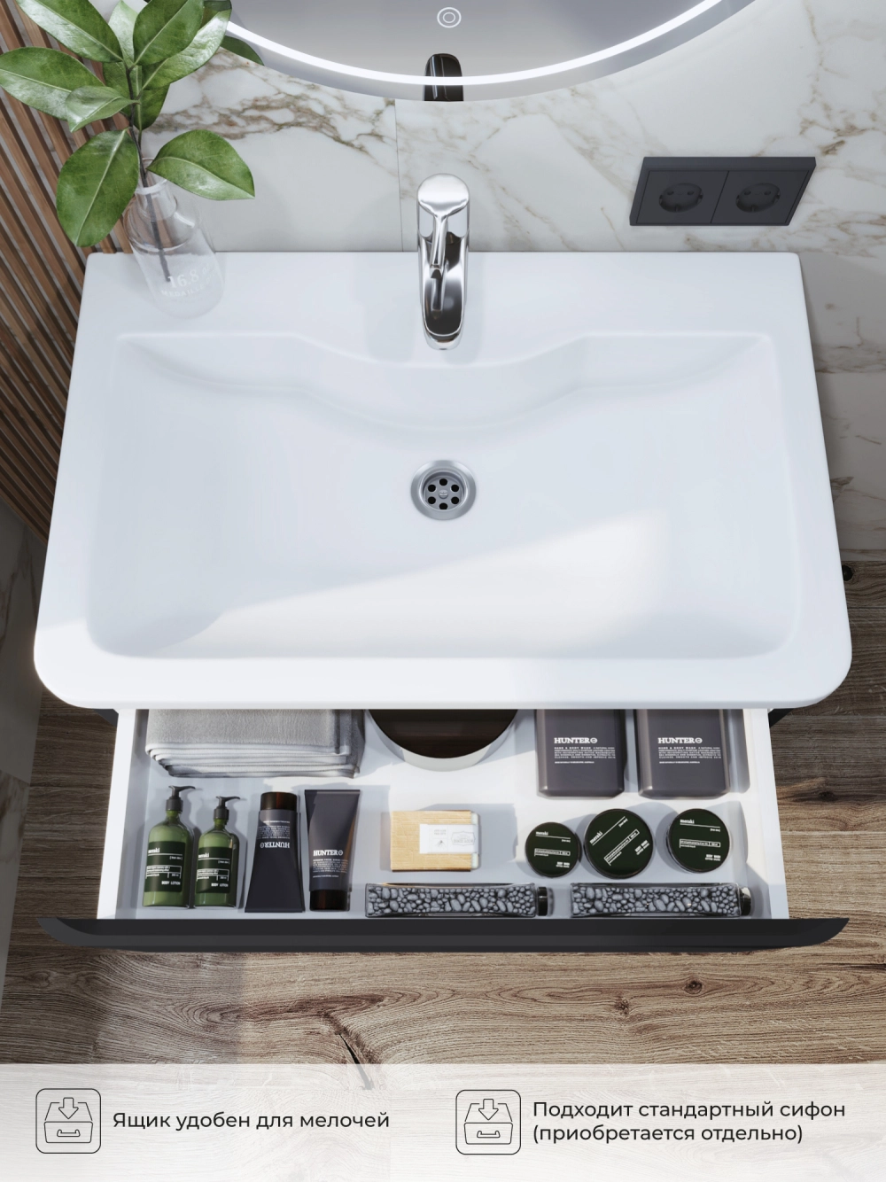 Напольная тумба под раковину в ванную из коллекции Roberto - это сочетание современной стилистики и богатого функционала. Тумба для ванны изготовлена из прочного МДФ, поэтому выдерживает высокие эксплуатационные нагрузки и обеспечивает дополнительную защиту тумбы под раковину от влаги и перепадов температуры. Качественная фурнитура с доводчиками обеспечивает легкое открывание и плавное закрывание ящиков. Вырез под сифон универсальный, для любого типа. Благодаря своей конструкции тумба обеспечивает удобный доступ к раковине и позволяет скрыть коммуникации. Тумба под раковину в ванную оснащена удобным ящиком для хранения, что позволяет разместить всё необходимое под рукой. Ручки интегрированы в фасад, что исключает возможность случайного удара о фурнитуру. Для точного выбора тумбы под раковину в ванную комнату рекомендуем обратиться к схеме замеров, которая находится на фото в карточке товара, размеры изделия могут отличаться +/-1 см в связи со спецификой производства. Тумба для ванной доставляется в предварительно собранном виде, надежно упакована.