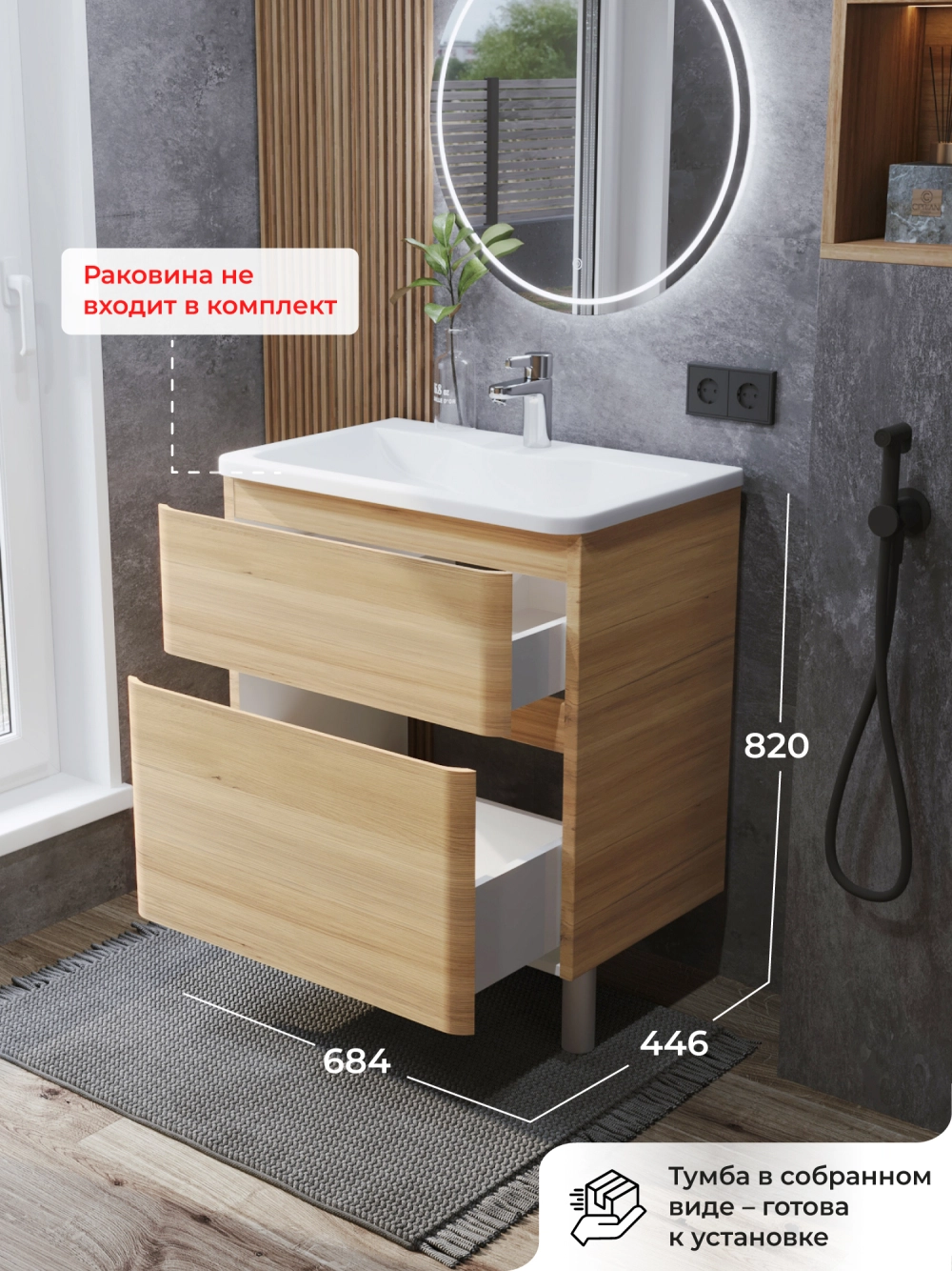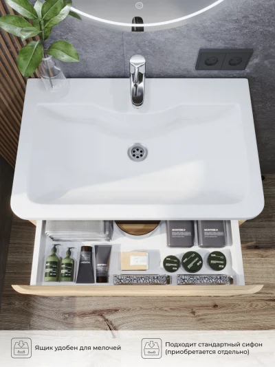 Напольная тумба под раковину в ванную из коллекции Roberto - это сочетание современной стилистики и богатого функционала. Тумба для ванны изготовлена из прочного МДФ, поэтому выдерживает высокие эксплуатационные нагрузки и обеспечивает дополнительную защиту тумбы под раковину от влаги и перепадов температуры. Качественная фурнитура с доводчиками обеспечивает легкое открывание и плавное закрывание ящиков. Вырез под сифон универсальный, для любого типа. Благодаря своей конструкции тумба обеспечивает удобный доступ к раковине и позволяет скрыть коммуникации. Тумба под раковину в ванную оснащена удобным ящиком для хранения, что позволяет разместить всё необходимое под рукой. Ручки интегрированы в фасад, что исключает возможность случайного удара о фурнитуру. Для точного выбора тумбы под раковину в ванную комнату рекомендуем обратиться к схеме замеров, которая находится на фото в карточке товара, размеры изделия могут отличаться +/-1 см в связи со спецификой производства. Тумба для ванной доставляется в предварительно собранном виде, надежно упакована.