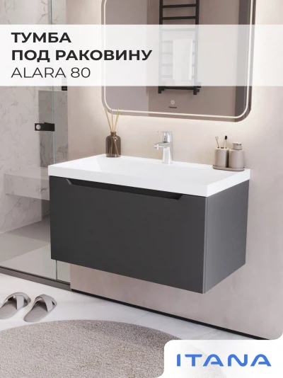 Представляем вашему вниманию стильную подвесную тумбу под раковину Итана Alara, выполненную в элегантном графитовом цвете. Этот аксессуар для ванной комнаты идеально сочетает в себе функциональность и современный дизайн. Размеры тумбы обеспечивают достаточное пространство для хранения необходимых предметов.<br>Благодаря своему лаконичному и компактному дизайну, этот элемент мебели не только делает пространство более стильным, но и помогает эффективно организовать хранение. Она станет отличным решением для тех, кто ценит минимализм и удобство. Подвесная тумба обеспечивает легкость уборки под ней и визуально увеличивает пространство. Изготавливается из качественных материалов, что гарантирует долговечность и износостойкость. Конструкция предполагает простоту монтажа и эксплуатации. Тумба обязательно дополнит вашу ванную, сделает её более уютной и функциональной.