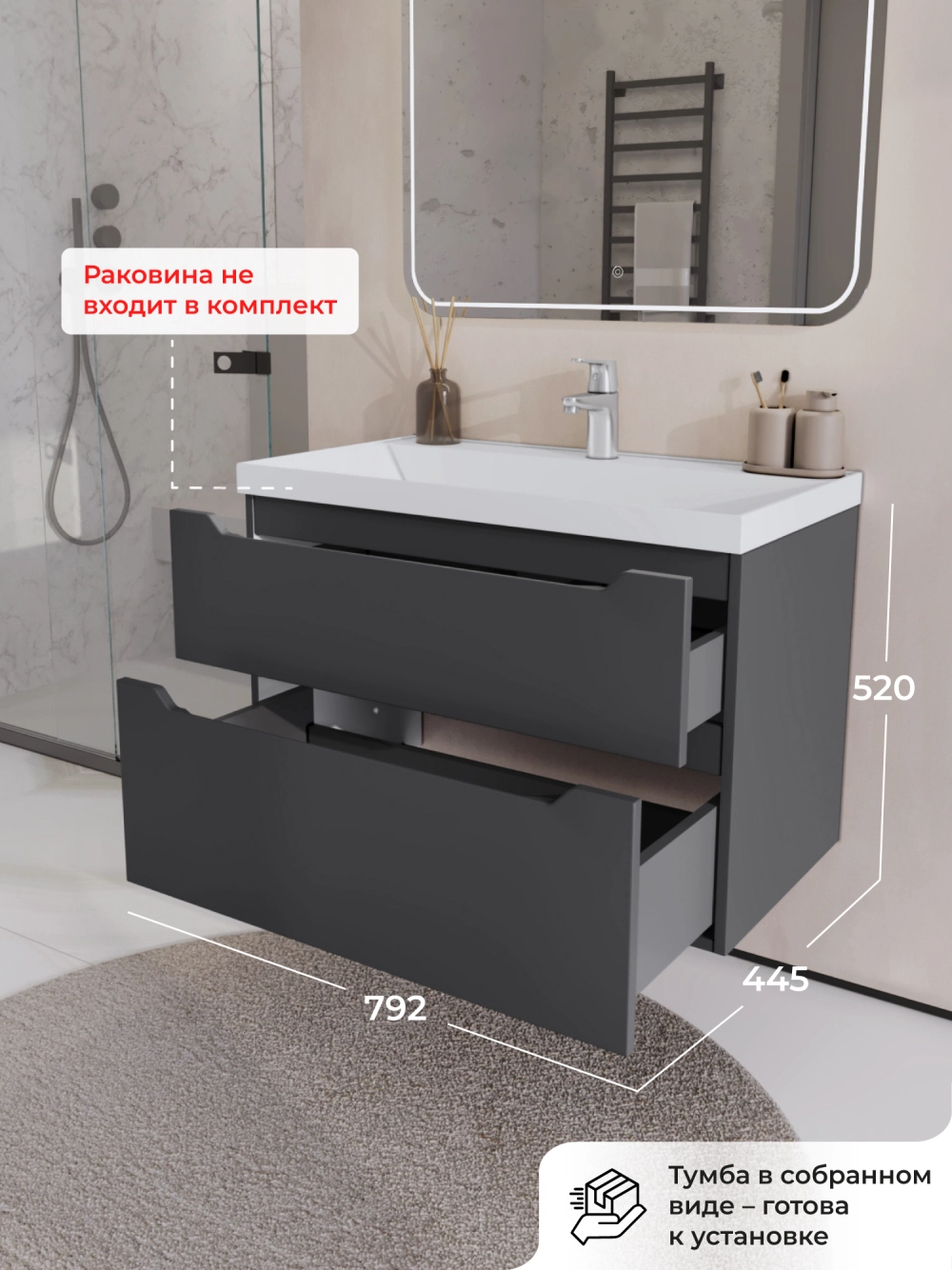 Тумба под раковину в ванную Итана из коллекции Alara. Тумба в ванную отличается элегантным дизайном и качественным исполнением, прекрасно сочетая функциональность и эстетическую привлекательность. Размеры подвесной тумбы под раковину 792*445*520 - идеальный выбор для ванной комнаты или туалета. Подвесная конструкция тумбы под раковину позволяет сэкономить место на полу и визуально расширяет пространство. Тумба под раковину в ванную подвесная выполнена из МФД, что гарантирует долговечность эксплуатации и износостойкость. Качественная фурнитура с доводчиками обеспечивает легкое открывание и плавное закрывание ящиков. Тумба под раковину с двумя ящиками, где можно рационально распределить и разместить все необходимые вещи для ванной комнаты. Для точного выбора тумбы рекомендуем обратиться к схеме замеров, которая находится на фото в карточке товара. Размеры изделия могут отличаться +/-1 см в связи со спецификой производства. Подвесная тумба под раковину приходит в надежной упаковке и в собранном виде.