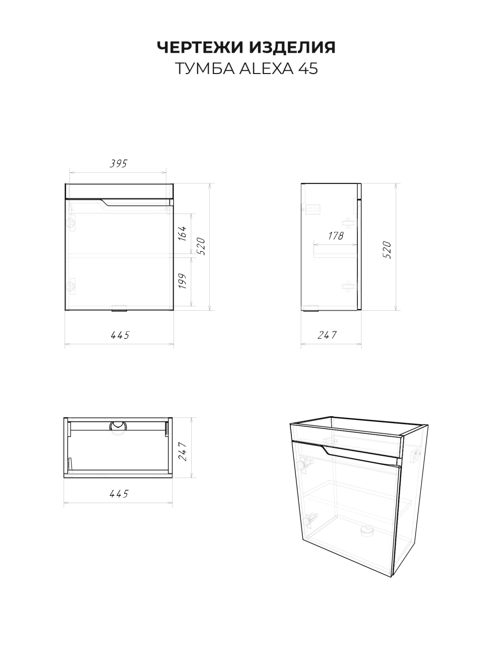 Тумба под раковину в ванную Итана из коллекции Alexa. Тумба в ванную отличается элегантным дизайном и качественным исполнением, прекрасно сочетая функциональность и эстетическую привлекательность. Размеры подвесной тумбы под раковину 445*247*520 - идеальный выбор для ванной комнаты или туалета. Подвесная конструкция тумбы под раковину позволяет сэкономить место на полу и визуально расширяет пространство. Тумба под раковину в ванную подвесная выполнена из МФД, что гарантирует долговечность эксплуатации и износостойкость. Качественная фурнитура с доводчиками обеспечивает легкое открывание и плавное закрывание. Ручки интегрированы в фасад, что исключает возможность случайного удара о фурнитуру. Тумба под раковину с полками внутри, где можно рационально распределить и разместить все необходимые вещи для ванной комнаты. Для точного выбора тумбы рекомендуем обратиться к схеме замеров, которая находится на фото в карточке товара. Размеры изделия могут отличаться +/-1 см в связи со спецификой производства. Подвесная тумба под раковину приходит в надежной упаковке и в собранном виде.