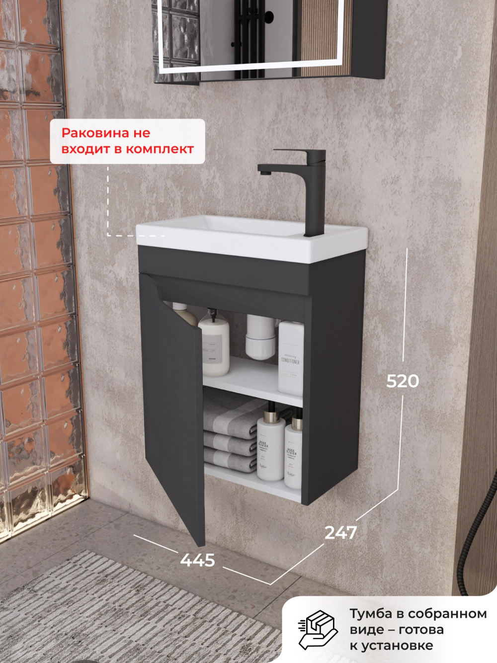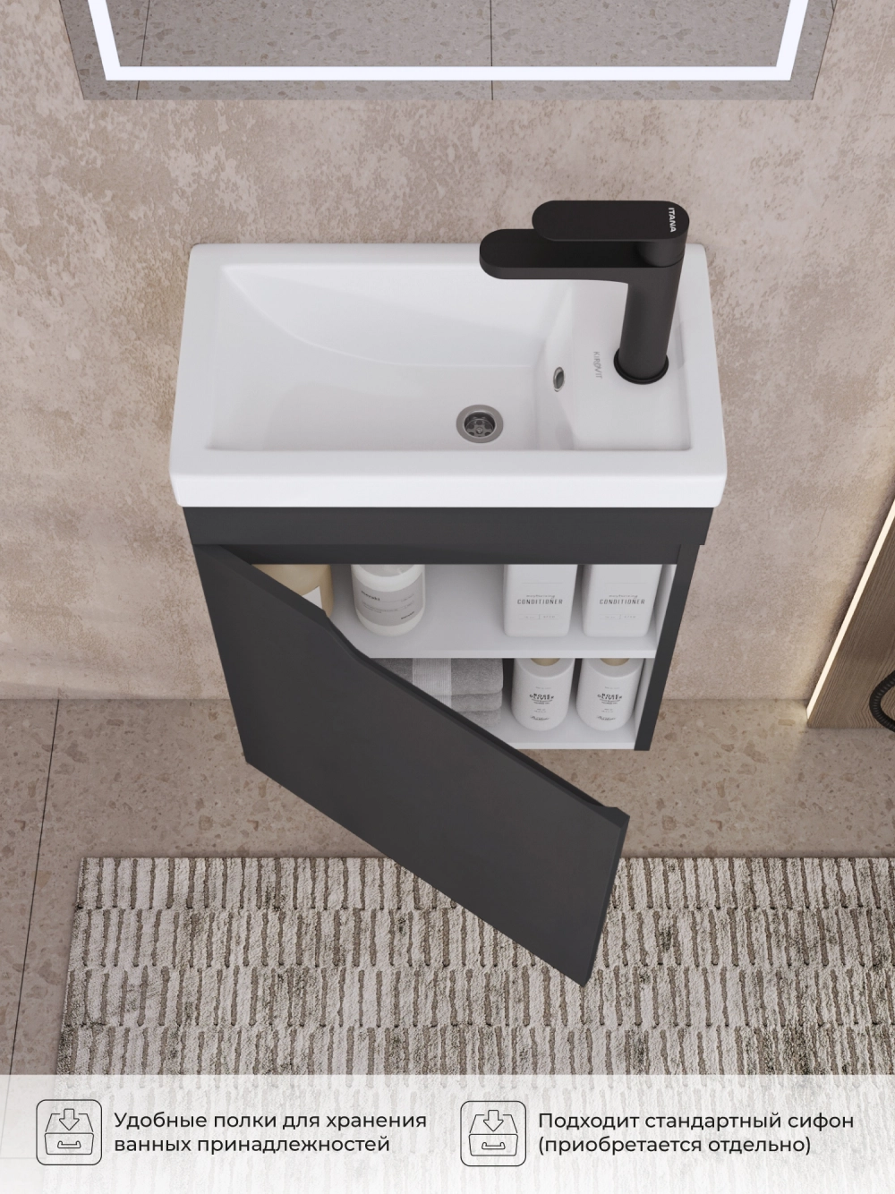Тумба под раковину подвесная Итана Alexa 45 с распашной дверцей левая узкая Графит