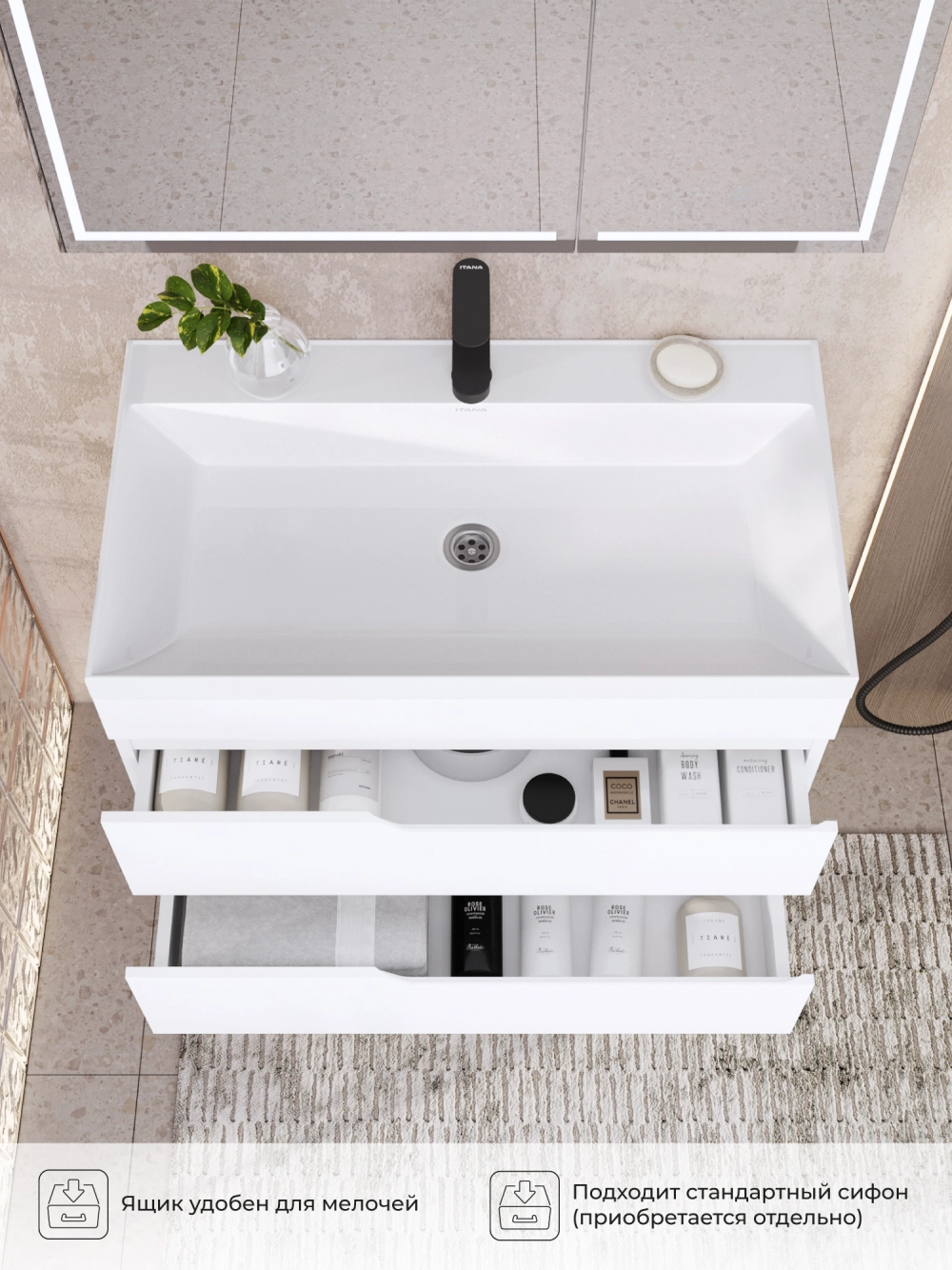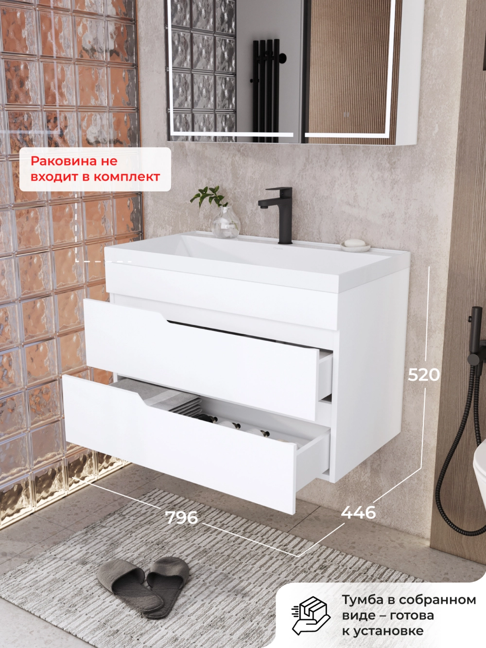 Тумба под раковину в ванную Итана из коллекции Alexa. Тумба в ванную отличается элегантным дизайном и качественным исполнением, прекрасно сочетая функциональность и эстетическую привлекательность. Размеры подвесной тумбы под раковину 796*446*520 - идеальный выбор для ванной комнаты или туалета. Подвесная конструкция тумбы под раковину позволяет сэкономить место на полу и визуально расширяет пространство. Тумба под раковину в ванную подвесная выполнена из МФД, что гарантирует долговечность эксплуатации и износостойкость. Качественная фурнитура с доводчиками обеспечивает легкое открывание и плавное закрывание ящиков. Ручки интегрированы в фасад, что исключает возможность случайного удара о фурнитуру. Тумба под раковину с ящиками, где можно рационально распределить и разместить все необходимые вещи для ванной комнаты. Для точного выбора тумбы рекомендуем обратиться к схеме замеров, которая находится на фото в карточке товара. Размеры изделия могут отличаться +/-1 см в связи со спецификой производства. Подвесная тумба под раковину приходит в надежной упаковке и в собранном виде.