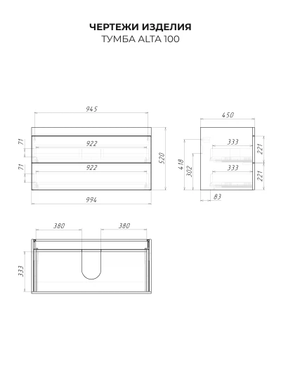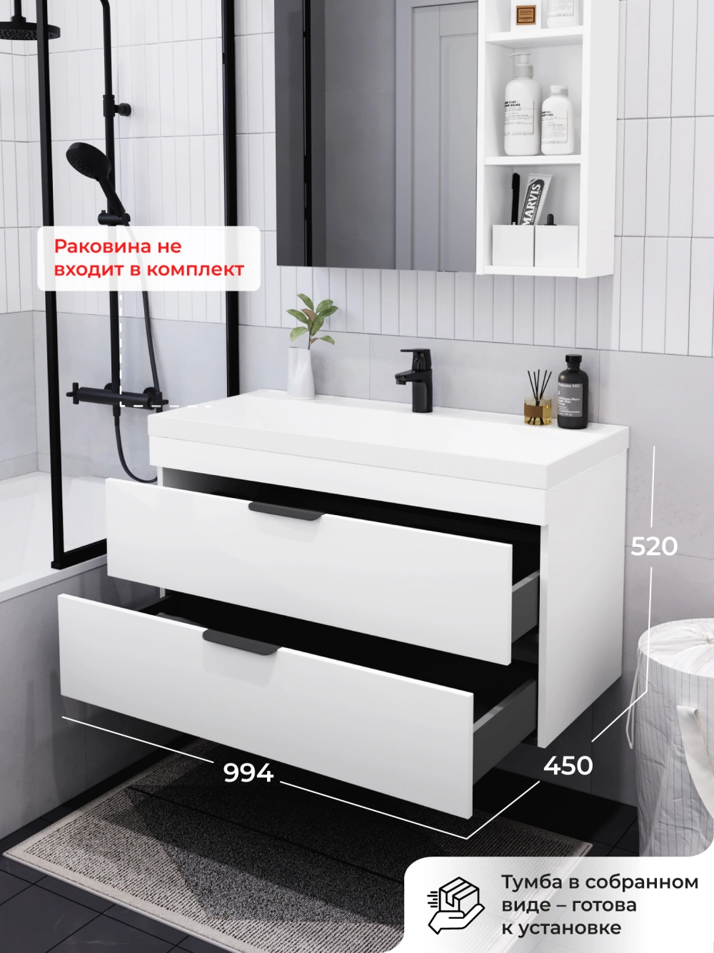 Подвесная тумба под раковину из коллекции Alta станет настоящим украшением ванной комнаты в современном стиле. Навесной способ установки тумбы в ванную дает возможность не только визуально увеличить пространство, но и обеспечивает быстрый и удобный доступ для уборки. Размеры подвесной тумбы под раковину 994*450*520 - идеальный выбор для ванной комнаты или туалета. Тумба под раковину изготовлена из ламинированного ДСП, поэтому выдерживает высокие эксплуатационные нагрузки. Качественная фурнитура с доводчиками обеспечивает легкое открывание и плавное закрывание ящиков. Вырез под сифон универсальный, для любого типа. Благодаря своей конструкции тумба обеспечивает удобный доступ к раковине и позволяет скрыть коммуникации. Тумба под раковину в ванную оснащена двумя удобными ящиками для хранения, что позволяет разместить всё необходимое под рукой. Для точного выбора подвесной тумбы под раковину в ванную комнату рекомендуем обратиться к схеме замеров, которая находится на фото в карточке товара, размеры изделия могут отличаться +/-1 см в связи со спецификой производства. Тумба для ванной доставляется в предварительно собранном виде, надежно упакована.