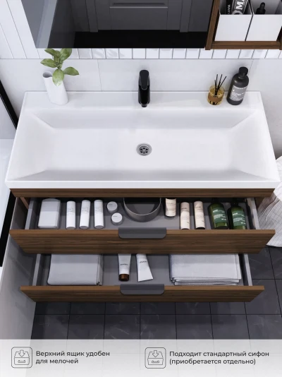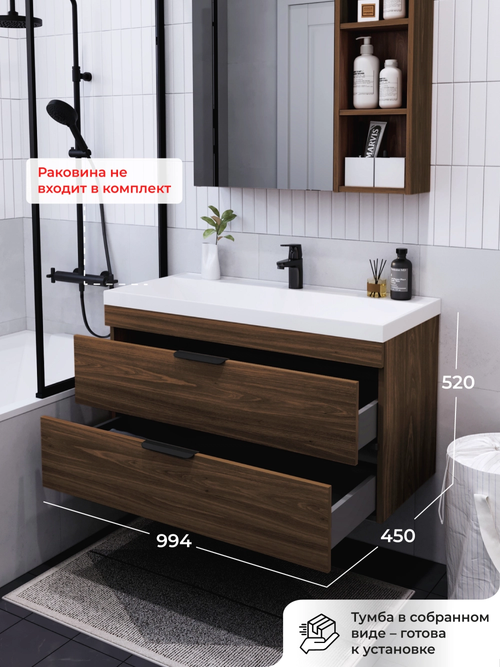 Подвесная тумба под раковину из коллекции Alta станет настоящим украшением ванной комнаты в современном стиле. Навесной способ установки тумбы в ванную дает возможность не только визуально увеличить пространство, но и обеспечивает быстрый и удобный доступ для уборки. Размеры подвесной тумбы под раковину 994*450*520 - идеальный выбор для ванной комнаты или туалета. Тумба под раковину изготовлена из ламинированного ДСП, поэтому выдерживает высокие эксплуатационные нагрузки. Качественная фурнитура с доводчиками обеспечивает легкое открывание и плавное закрывание ящиков. Вырез под сифон универсальный, для любого типа. Благодаря своей конструкции тумба обеспечивает удобный доступ к раковине и позволяет скрыть коммуникации. Тумба под раковину в ванную оснащена двумя удобными ящиками для хранения, что позволяет разместить всё необходимое под рукой. Для точного выбора подвесной тумбы под раковину в ванную комнату рекомендуем обратиться к схеме замеров, которая находится на фото в карточке товара, размеры изделия могут отличаться +/-1 см в связи со спецификой производства. Тумба для ванной доставляется в предварительно собранном виде, надежно упакована.