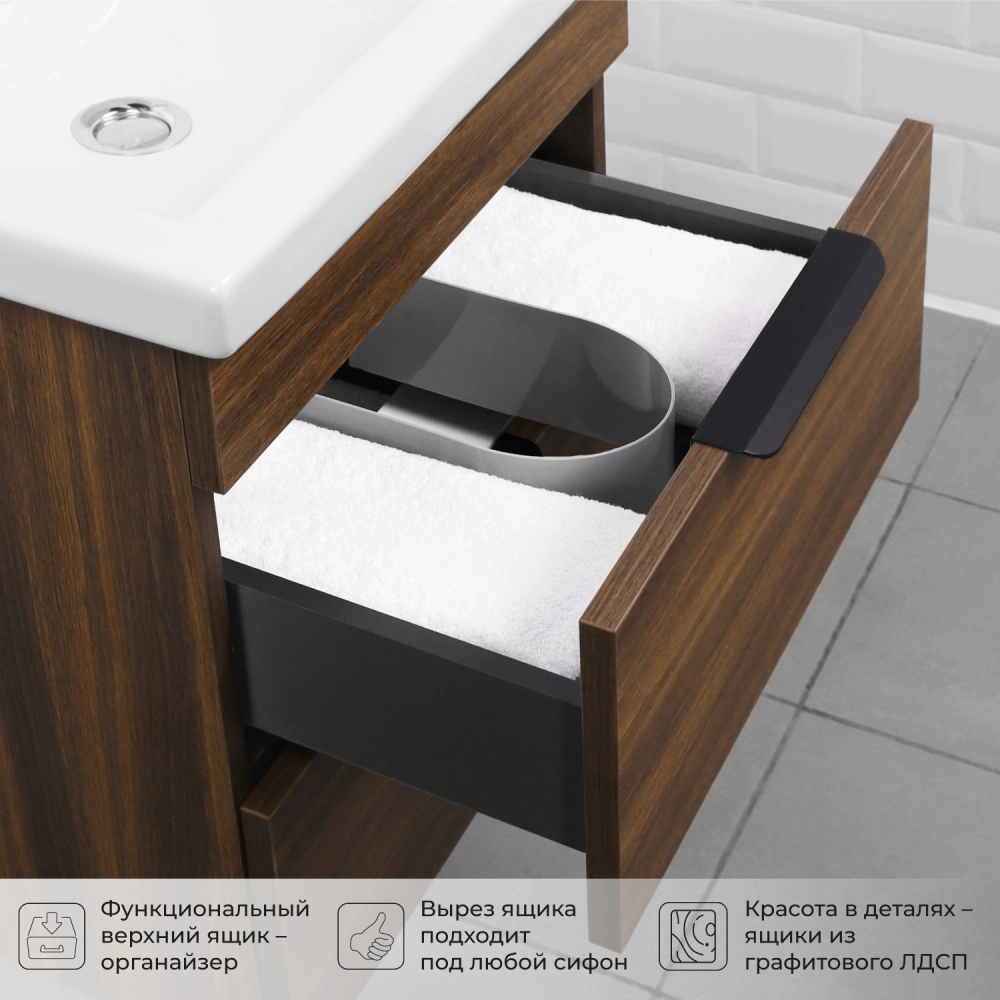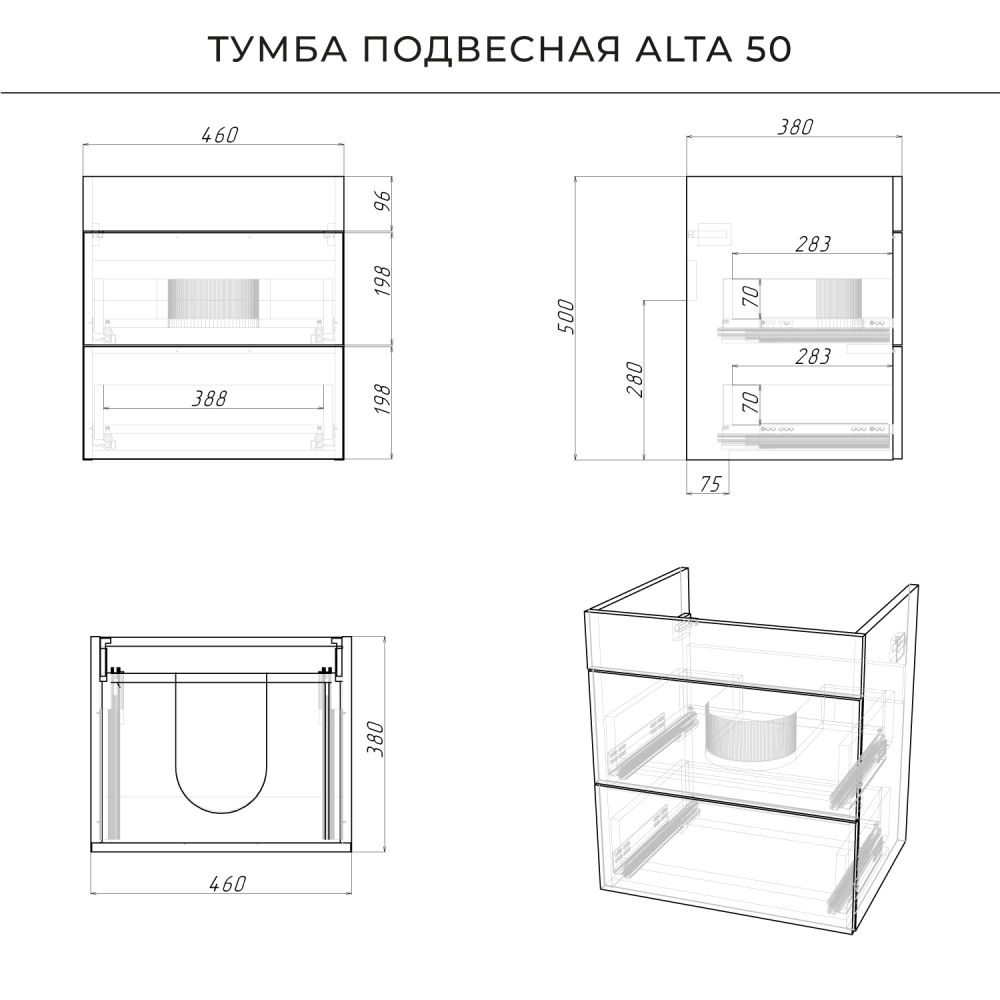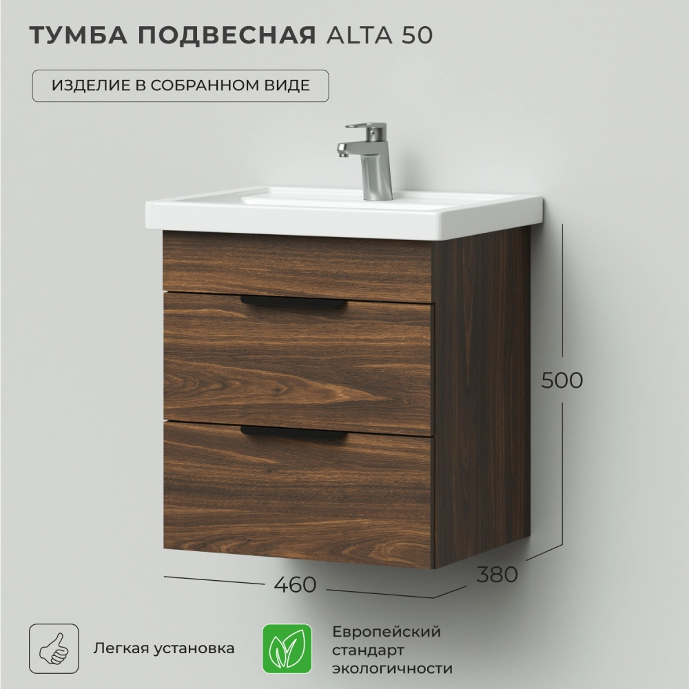 Подвесная тумба под раковину из коллекции Alta станет настоящим украшением ванной комнаты в современном стиле. Навесной способ установки тумбы в ванную дает возможность не только визуально увеличить пространство, но и обеспечивает быстрый и удобный доступ для уборки. Размеры подвесной тумбы под раковину 460*380*500 - идеальный выбор для ванной комнаты или туалета. Тумба под раковину изготовлена из ламинированного ДСП, поэтому выдерживает высокие эксплуатационные нагрузки. Качественная фурнитура с доводчиками обеспечивает легкое открывание и плавное закрывание ящиков. Вырез под сифон универсальный, для любого типа. Благодаря своей конструкции тумба обеспечивает удобный доступ к раковине и позволяет скрыть коммуникации. Тумба под раковину в ванную оснащена двумя удобными ящиками для хранения, что позволяет разместить всё необходимое под рукой. Для точного выбора подвесной тумбы под раковину в ванную комнату рекомендуем обратиться к схеме замеров, которая находится на фото в карточке товара, размеры изделия могут отличаться +/-1 см в связи со спецификой производства. Тумба для ванной доставляется в предварительно собранном виде, надежно упакована.