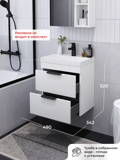 Подвесная тумба под раковину из коллекции Alta станет настоящим украшением ванной комнаты в современном стиле. Навесной способ установки тумбы в ванную дает возможность не только визуально увеличить пространство, но и обеспечивает быстрый и удобный доступ для уборки. Размеры подвесной тумбы под раковину 490*342*520 - идеальный выбор для ванной комнаты или туалета. Тумба под раковину изготовлена из ламинированного ДСП, поэтому выдерживает высокие эксплуатационные нагрузки. Качественная фурнитура с доводчиками обеспечивает легкое открывание и плавное закрывание ящиков. Вырез под сифон универсальный, для любого типа. Благодаря своей конструкции тумба обеспечивает удобный доступ к раковине и позволяет скрыть коммуникации. Тумба под раковину в ванную оснащена двумя удобными ящиками для хранения, что позволяет разместить всё необходимое под рукой. Для точного выбора подвесной тумбы под раковину в ванную комнату рекомендуем обратиться к схеме замеров, которая находится на фото в карточке товара, размеры изделия могут отличаться +/-1 см в связи со спецификой производства. Тумба для ванной доставляется в предварительно собранном виде, надежно упакована.