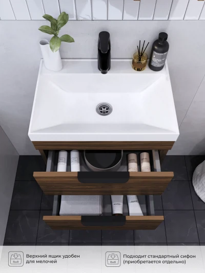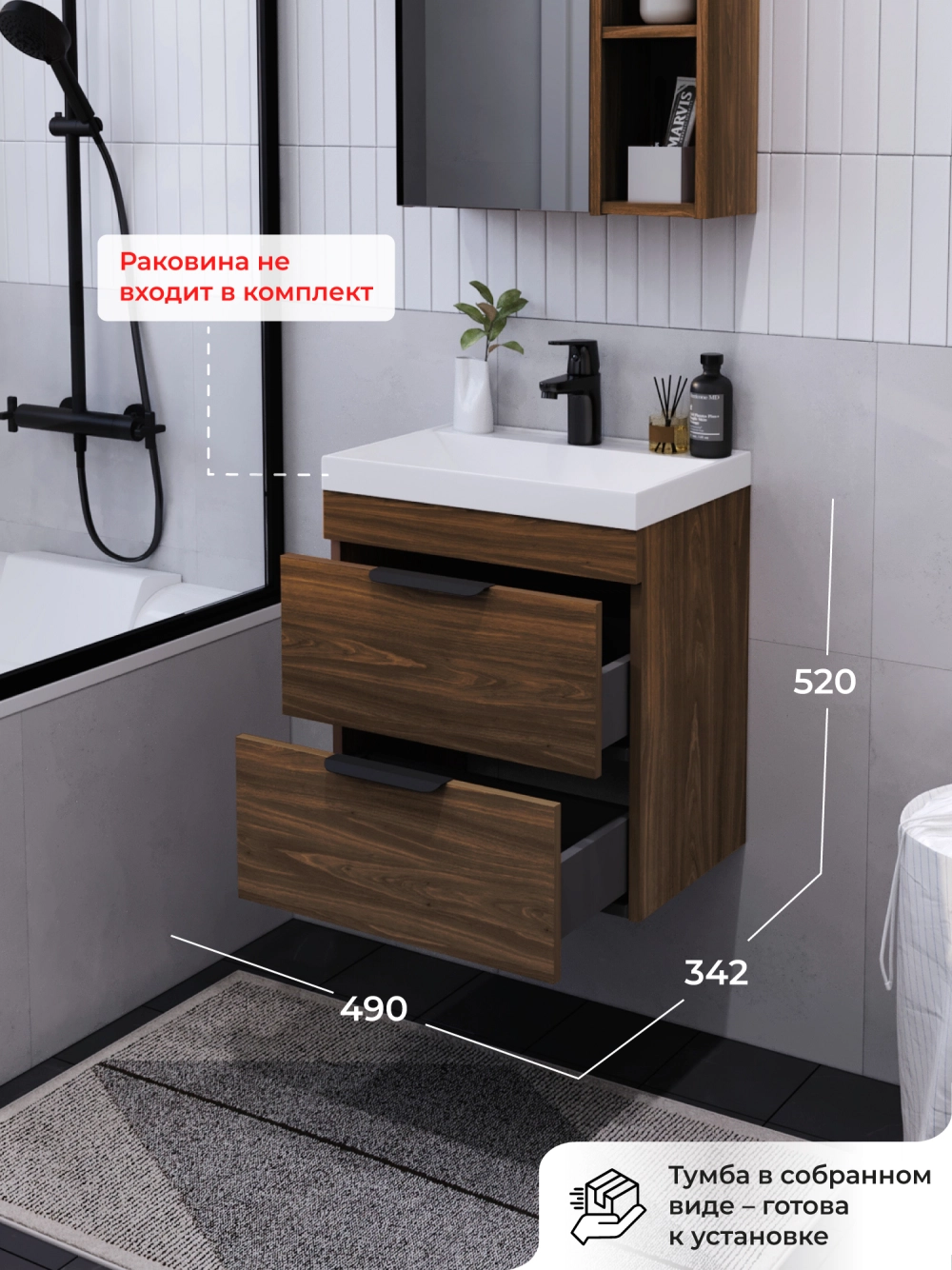 Подвесная тумба под раковину из коллекции Alta станет настоящим украшением ванной комнаты в современном стиле. Навесной способ установки тумбы в ванную дает возможность не только визуально увеличить пространство, но и обеспечивает быстрый и удобный доступ для уборки. Размеры подвесной тумбы под раковину 490*342*520 - идеальный выбор для ванной комнаты или туалета. Тумба под раковину изготовлена из ламинированного ДСП, поэтому выдерживает высокие эксплуатационные нагрузки. Качественная фурнитура с доводчиками обеспечивает легкое открывание и плавное закрывание ящиков. Вырез под сифон универсальный, для любого типа. Благодаря своей конструкции тумба обеспечивает удобный доступ к раковине и позволяет скрыть коммуникации. Тумба под раковину в ванную оснащена двумя удобными ящиками для хранения, что позволяет разместить всё необходимое под рукой. Для точного выбора подвесной тумбы под раковину в ванную комнату рекомендуем обратиться к схеме замеров, которая находится на фото в карточке товара, размеры изделия могут отличаться +/-1 см в связи со спецификой производства. Тумба для ванной доставляется в предварительно собранном виде, надежно упакована.