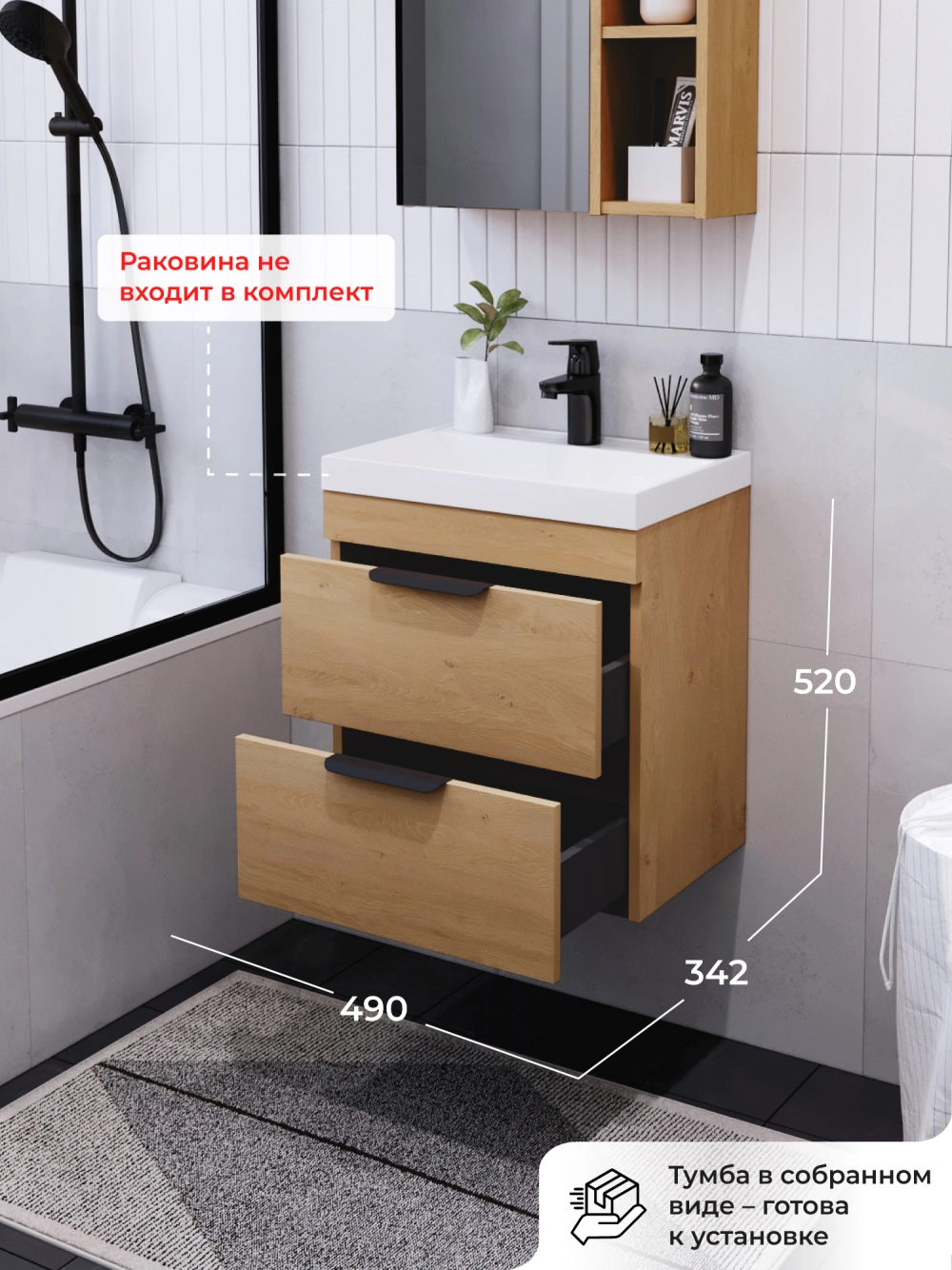 Подвесная тумба под раковину из коллекции Alta станет настоящим украшением ванной комнаты в современном стиле. Навесной способ установки тумбы в ванную дает возможность не только визуально увеличить пространство, но и обеспечивает быстрый и удобный доступ для уборки. Размеры подвесной тумбы под раковину 490*342*520 - идеальный выбор для ванной комнаты или туалета. Тумба под раковину изготовлена из ламинированного ДСП, поэтому выдерживает высокие эксплуатационные нагрузки. Качественная фурнитура с доводчиками обеспечивает легкое открывание и плавное закрывание ящиков. Вырез под сифон универсальный, для любого типа. Благодаря своей конструкции тумба обеспечивает удобный доступ к раковине и позволяет скрыть коммуникации. Тумба под раковину в ванную оснащена двумя удобными ящиками для хранения, что позволяет разместить всё необходимое под рукой. Для точного выбора подвесной тумбы под раковину в ванную комнату рекомендуем обратиться к схеме замеров, которая находится на фото в карточке товара, размеры изделия могут отличаться +/-1 см в связи со спецификой производства. Тумба для ванной доставляется в предварительно собранном виде, надежно упакована.