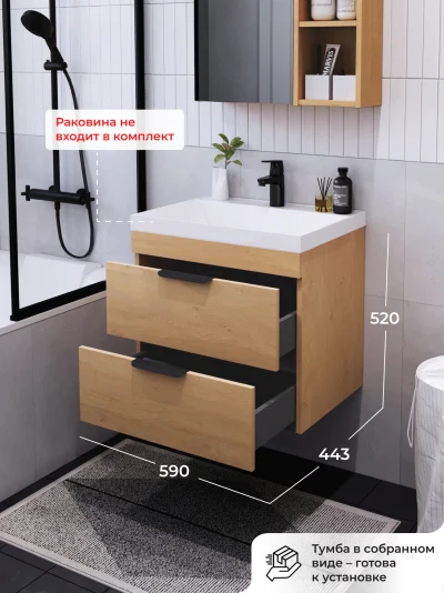 Подвесная тумба под раковину из коллекции Alta станет настоящим украшением ванной комнаты в современном стиле. Навесной способ установки тумбы в ванную дает возможность не только визуально увеличить пространство, но и обеспечивает быстрый и удобный доступ для уборки. Размеры подвесной тумбы под раковину 590*443*520 - идеальный выбор для ванной комнаты или туалета.Тумба под раковину изготовлена из ламинированного ДСП, поэтому выдерживает высокие эксплуатационные нагрузки. Качественная фурнитура с доводчиками обеспечивает легкое открывание и плавное закрывание ящиков. Вырез под сифон универсальный, для любого типа. Благодаря своей конструкции тумба обеспечивает удобный доступ к раковине и позволяет скрыть коммуникации. Тумба под раковину в ванную оснащена двумя удобными ящиками для хранения, что позволяет разместить всё необходимое под рукой. Для точного выбора подвесной тумбы под раковину в ванную комнату рекомендуем обратиться к схеме замеров, которая находится на фото в карточке товара, размеры изделия могут отличаться +/-1 см в связи со спецификой производства. Тумба для ванной доставляется в предварительно собранном виде, надежно упакована.