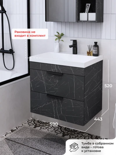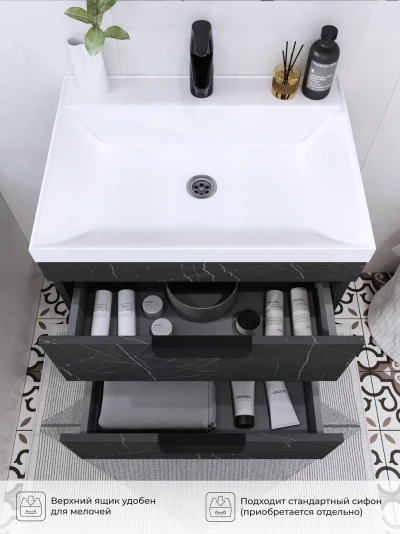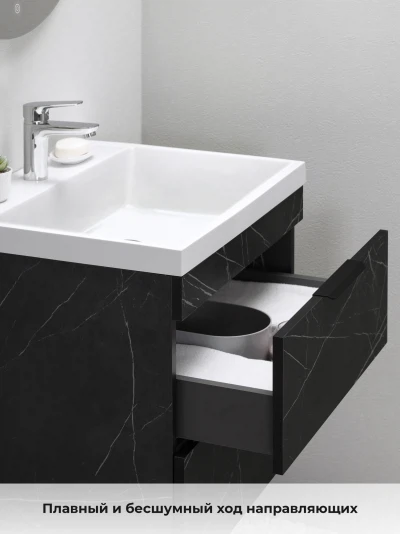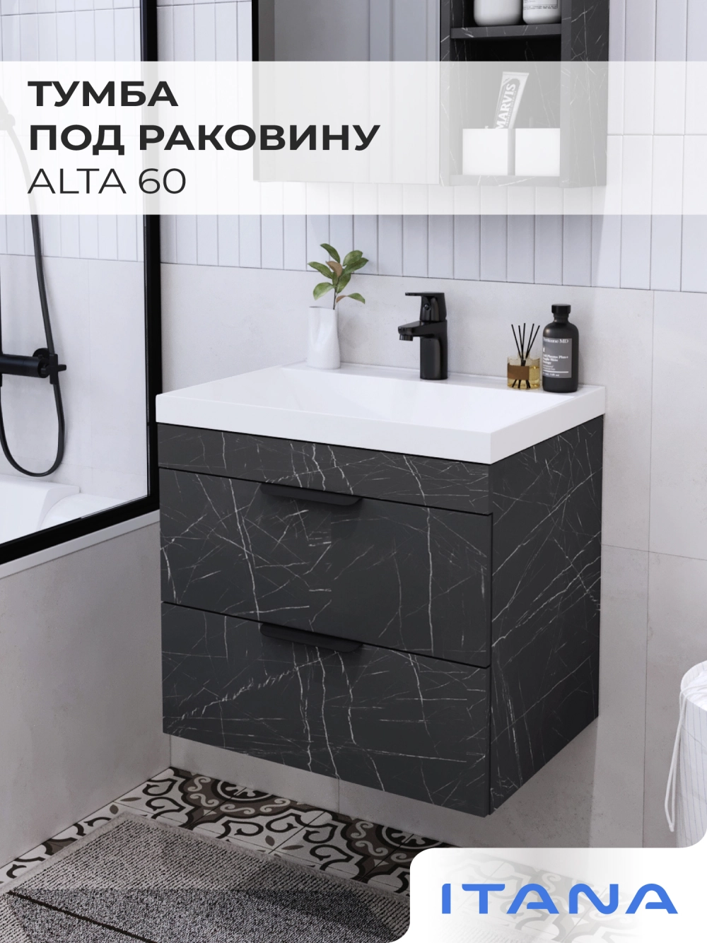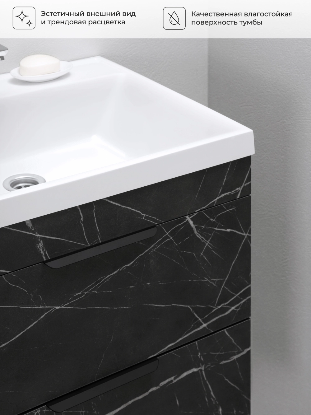 Тумба под раковину подвесная Итана Alta 60 с выдвижными ящиками под умывальник Clarissa 60 Камень Пьетра Гриджиа Черный