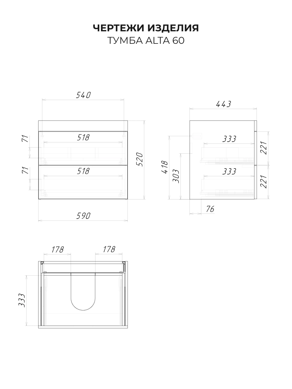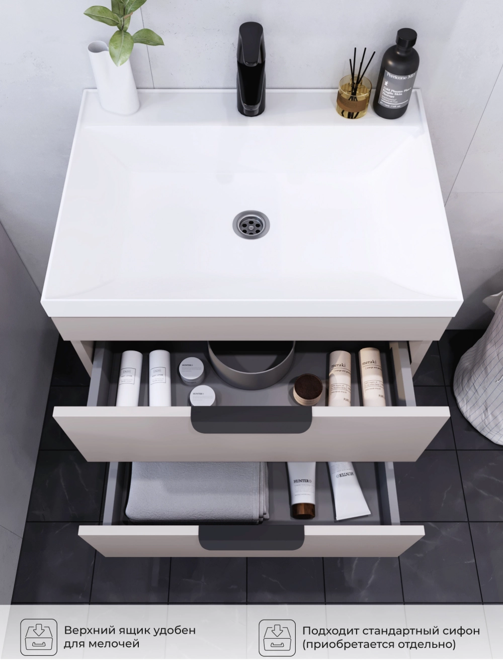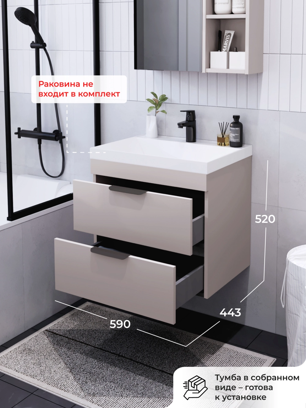 Подвесная тумба под раковину из коллекции Alta станет настоящим украшением ванной комнаты в современном стиле. Навесной способ установки тумбы в ванную дает возможность не только визуально увеличить пространство, но и обеспечивает быстрый и удобный доступ для уборки. Размеры подвесной тумбы под раковину 590*443*520 - идеальный выбор для ванной комнаты или туалета.Тумба под раковину изготовлена из ламинированного ДСП, поэтому выдерживает высокие эксплуатационные нагрузки. Качественная фурнитура с доводчиками обеспечивает легкое открывание и плавное закрывание ящиков. Вырез под сифон универсальный, для любого типа. Благодаря своей конструкции тумба обеспечивает удобный доступ к раковине и позволяет скрыть коммуникации. Тумба под раковину в ванную оснащена двумя удобными ящиками для хранения, что позволяет разместить всё необходимое под рукой. . Для точного выбора подвесной тумбы под раковину в ванную комнату рекомендуем обратиться к схеме замеров, которая находится на фото в карточке товара, размеры изделия могут отличаться +/-1 см в связи со спецификой производства. Тумба для ванной доставляется в предварительно собранном виде, надежно упакована.