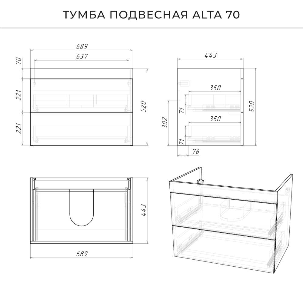 Подвесная тумба под раковину из коллекции Alta станет настоящим украшением ванной комнаты в современном стиле. Навесной способ установки тумбы в ванную дает возможность не только визуально увеличить пространство, но и обеспечивает быстрый и удобный доступ для уборки. Размеры подвесной тумбы под раковину 689*443*530 - идеальный выбор для ванной комнаты или туалета. Тумба под раковину изготовлена из ламинированного ДСП, поэтому выдерживает высокие эксплуатационные нагрузки. Качественная фурнитура с доводчиками обеспечивает легкое открывание и плавное закрывание ящиков. Вырез под сифон универсальный, для любого типа. Благодаря своей конструкции тумба обеспечивает удобный доступ к раковине и позволяет скрыть коммуникации. Тумба под раковину в ванную оснащена двумя удобными ящиками для хранения, что позволяет разместить всё необходимое под рукой. Для точного выбора подвесной тумбы под раковину в ванную комнату рекомендуем обратиться к схеме замеров, которая находится на фото в карточке товара, размеры изделия могут отличаться +/-1 см в связи со спецификой производства. Тумба для ванной доставляется в предварительно собранном виде, надежно упакована.