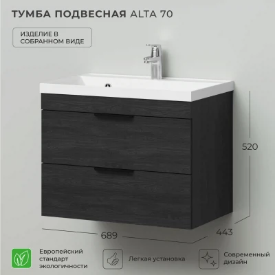 Подвесная тумба под раковину из коллекции Alta станет настоящим украшением ванной комнаты в современном стиле. Навесной способ установки тумбы в ванную дает возможность не только визуально увеличить пространство, но и обеспечивает быстрый и удобный доступ для уборки. Размеры подвесной тумбы под раковину 689*443*530 - идеальный выбор для ванной комнаты или туалета. Тумба под раковину изготовлена из ламинированного ДСП, поэтому выдерживает высокие эксплуатационные нагрузки. Качественная фурнитура с доводчиками обеспечивает легкое открывание и плавное закрывание ящиков. Вырез под сифон универсальный, для любого типа. Благодаря своей конструкции тумба обеспечивает удобный доступ к раковине и позволяет скрыть коммуникации. Тумба под раковину в ванную оснащена двумя удобными ящиками для хранения, что позволяет разместить всё необходимое под рукой. Для точного выбора подвесной тумбы под раковину в ванную комнату рекомендуем обратиться к схеме замеров, которая находится на фото в карточке товара, размеры изделия могут отличаться +/-1 см в связи со спецификой производства. Тумба для ванной доставляется в предварительно собранном виде, надежно упакована.