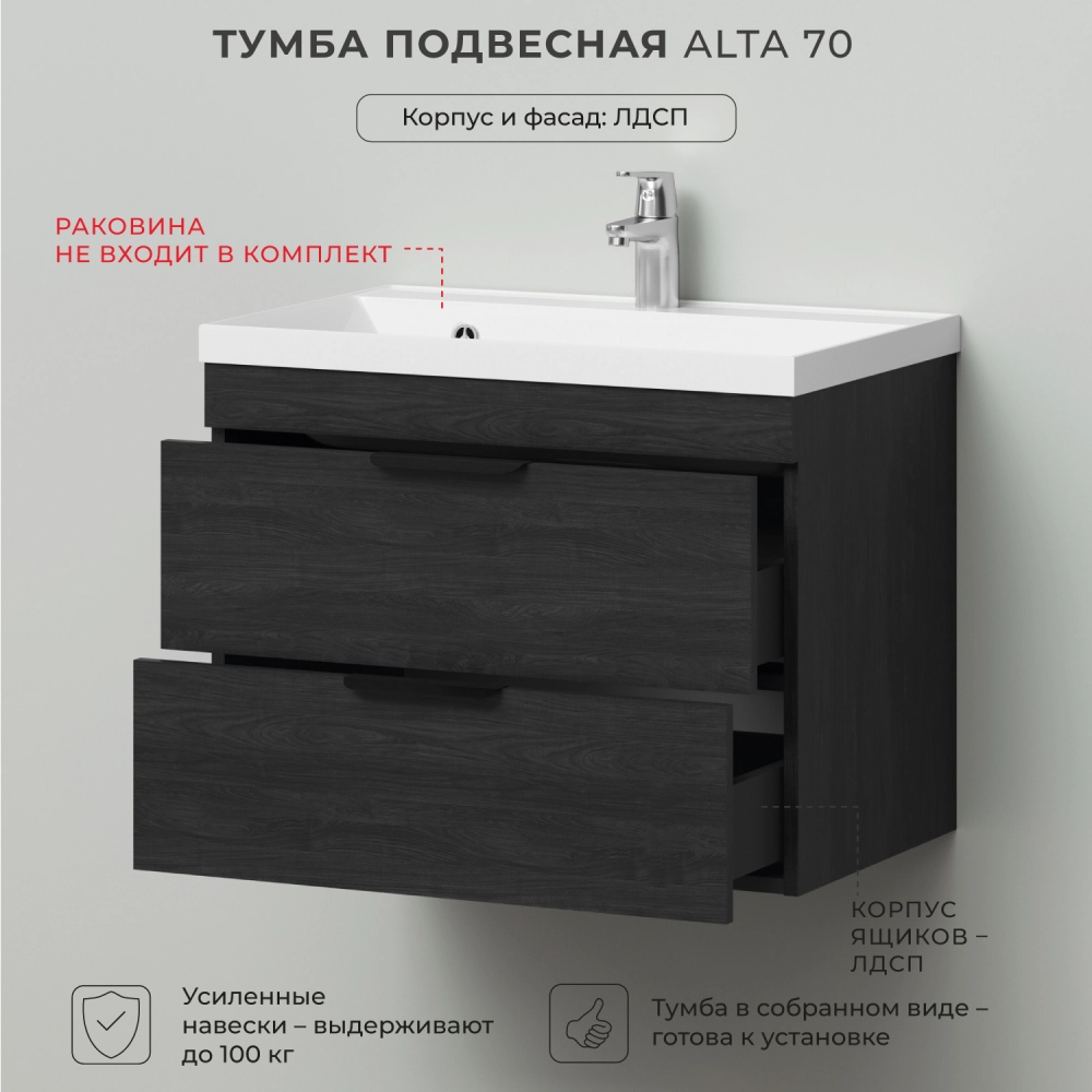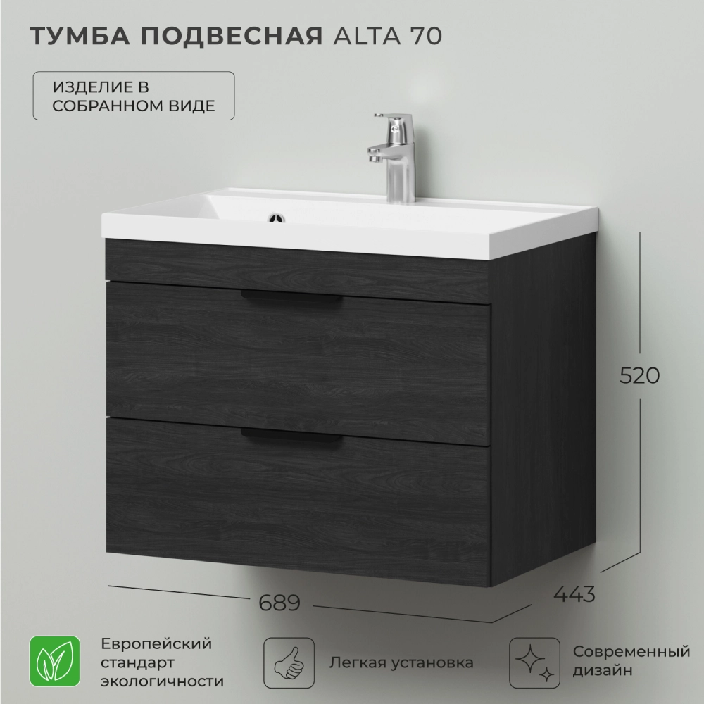 Тумба под раковину подвесная Итана Alta 70 с выдвижными ящиками под умывальник Clarissa 70 Морское дерево Карбон