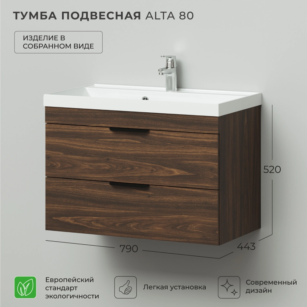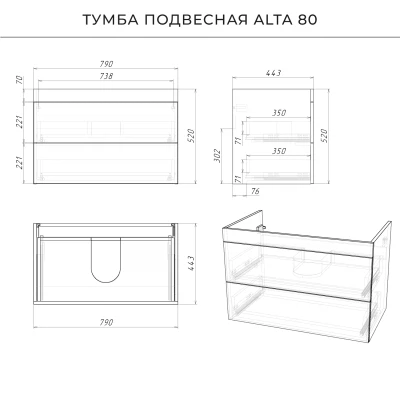 Подвесная тумба под раковину из коллекции Alta станет настоящим украшением ванной комнаты в современном стиле. Навесной способ установки тумбы в ванную дает возможность не только визуально увеличить пространство, но и обеспечивает быстрый и удобный доступ для уборки. Размеры подвесной тумбы под раковину 790*443*520 - идеальный выбор для ванной комнаты или туалета.Тумба с раковиной изготовлена из ламинированного ДСП, поэтому выдерживает высокие эксплуатационные нагрузки. Качественная фурнитура с доводчиками обеспечивает легкое открывание и плавное закрывание ящиков. Вырез под сифон универсальный, для любого типа. Благодаря своей конструкции тумба обеспечивает удобный доступ к раковине и позволяет скрыть коммуникации. Тумба под раковину в ванную оснащена двумя удобными ящиками для хранения, что позволяет разместить всё необходимое под рукой. Для точного выбора подвесной тумбы с раковиной в ванную комнату рекомендуем обратиться к схеме замеров, которая находится на фото в карточке товара, размеры изделия могут отличаться +/-1 см в связи со спецификой производства. Тумба для ванной доставляется в предварительно собранном виде, надежно упакована.