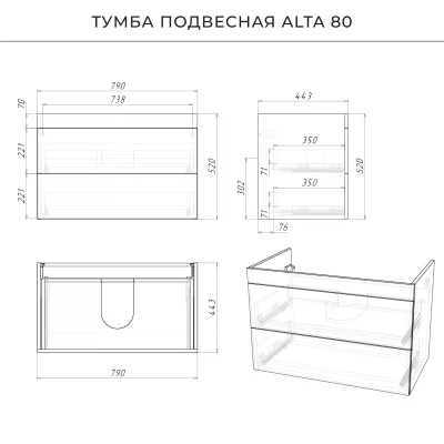 Подвесная тумба под раковину из коллекции Alta станет настоящим украшением ванной комнаты в современном стиле. Навесной способ установки тумбы в ванную дает возможность не только визуально увеличить пространство, но и обеспечивает быстрый и удобный доступ для уборки. Размеры подвесной тумбы под раковину 790*443*520 - идеальный выбор для ванной комнаты или туалета.Тумба с раковиной изготовлена из ламинированного ДСП, поэтому выдерживает высокие эксплуатационные нагрузки. Качественная фурнитура с доводчиками обеспечивает легкое открывание и плавное закрывание ящиков. Вырез под сифон универсальный, для любого типа. Благодаря своей конструкции тумба обеспечивает удобный доступ к раковине и позволяет скрыть коммуникации. Тумба под раковину в ванную оснащена двумя удобными ящиками для хранения, что позволяет разместить всё необходимое под рукой. Для точного выбора подвесной тумбы под раковину в ванную комнату рекомендуем обратиться к схеме замеров, которая находится на фото в карточке товара, размеры изделия могут отличаться +/-1 см в связи со спецификой производства. Тумба для ванной доставляется в предварительно собранном виде, надежно упакована.