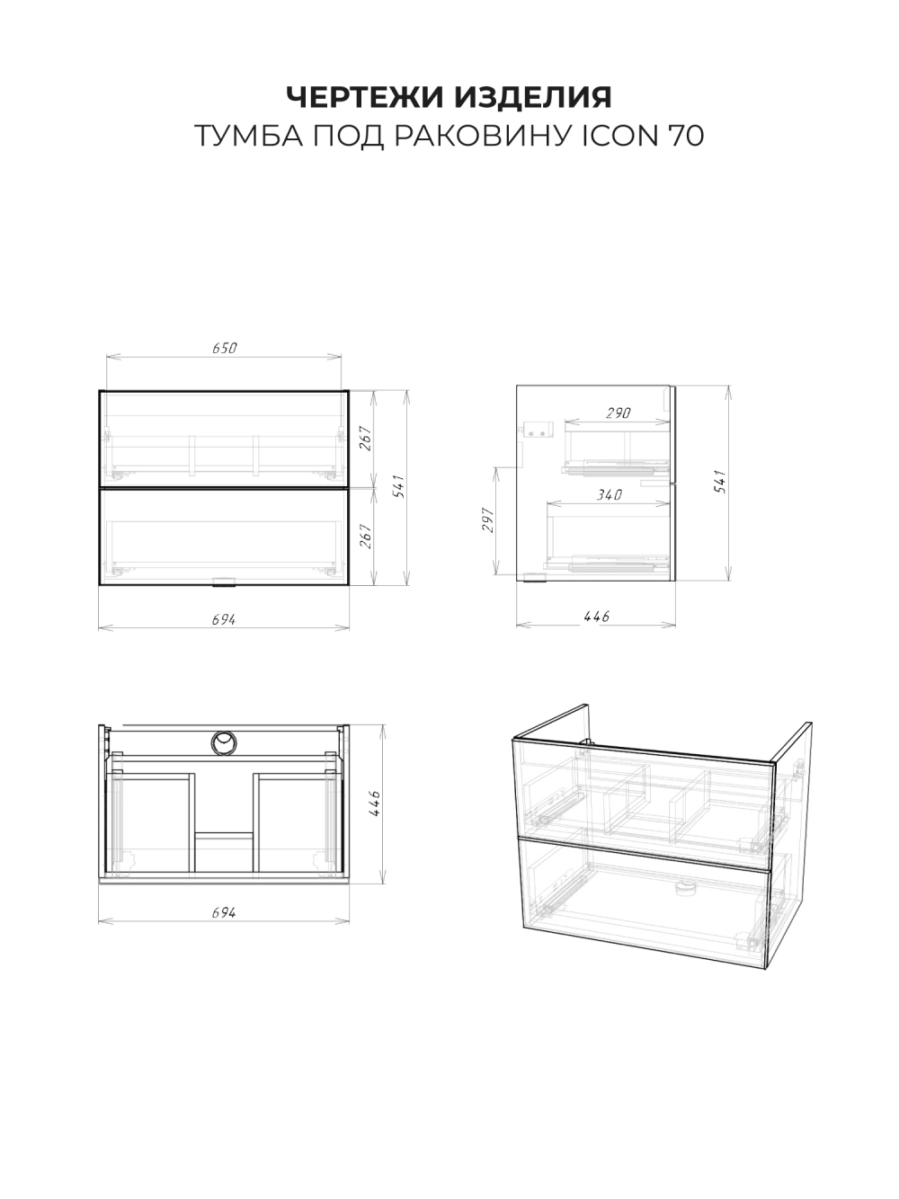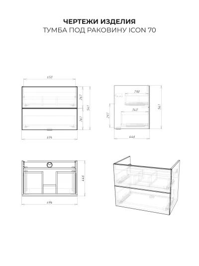 Подвесная тумба под раковину в ванную комнату из коллекции Icon - это сочетание современной стилистики и богатого функционала. Навесной способ установки тумбы в ванную дает возможность не только визуально увеличить пространство, но и обеспечивает быстрый и удобный доступ для уборки. Размеры подвесной тумбы под раковину 694х446х541 - идеальный выбор для ванной комнаты или туалета. Качественная фурнитура с доводчиками обеспечивает легкое открывание и плавное закрывание ящиков. Тумба под раковину с двумя ящиками, где можно рационально распределить и разместить все необходимые вещи для ванной комнаты. Вырез под сифон универсальный, для любого типа сифона. Для точного выбора тумбы под раковину в ванную комнату рекомендуем обратиться к схеме замеров, которая находится на фото в карточке товара, размеры изделия могут отличаться +/-1 см в связи со спецификой производства. Тумба под раковину для ванной доставляется в предварительно собранном виде, надежно упакована.