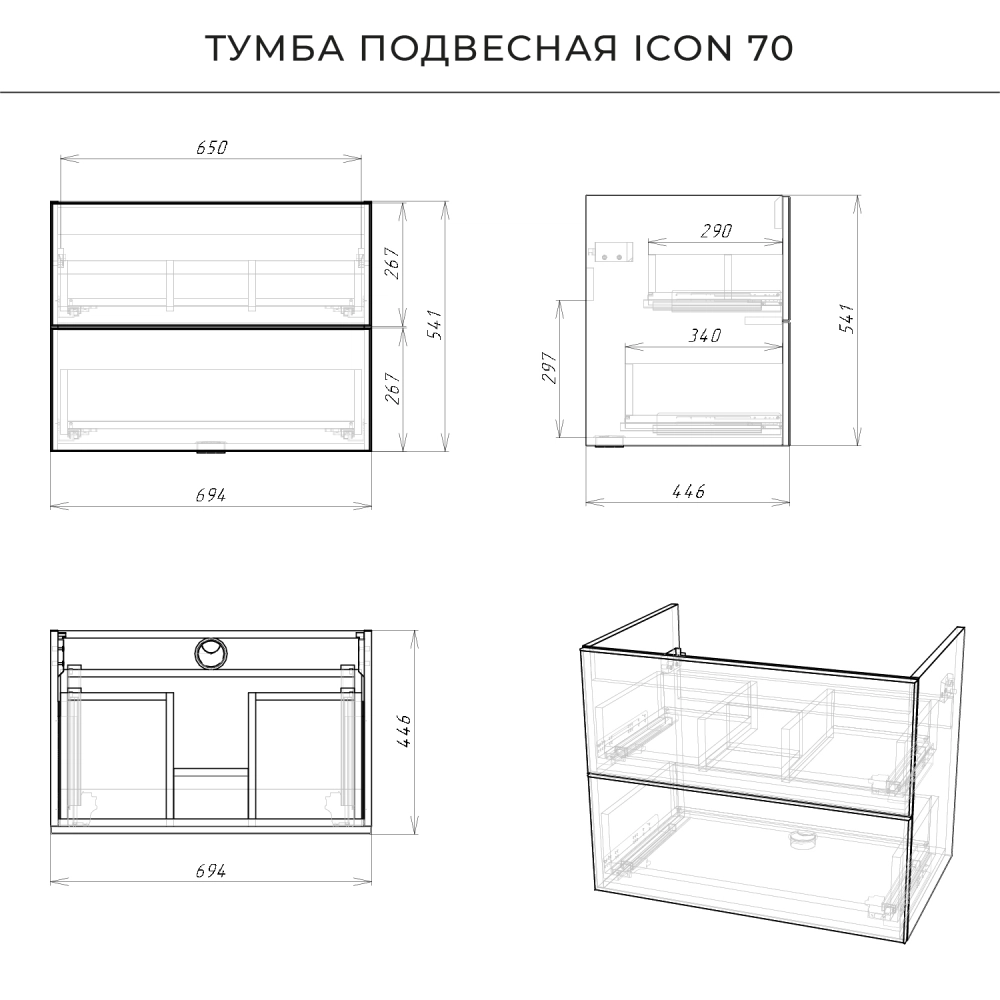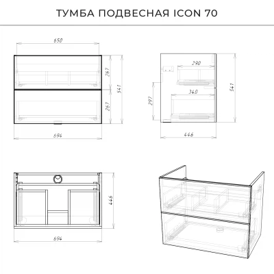 Подвесная тумба под раковину в ванную комнату из коллекции Icon - это сочетание современной стилистики и богатого функционала. Навесной способ установки тумбы в ванную дает возможность не только визуально увеличить пространство, но и обеспечивает быстрый и удобный доступ для уборки. Размеры подвесной тумбы под раковину 694х446х541 - идеальный выбор для ванной комнаты или туалета. Качественная фурнитура с доводчиками обеспечивает легкое открывание и плавное закрывание ящиков. Тумба под раковину с двумя ящиками, где можно рационально распределить и разместить все необходимые вещи для ванной комнаты. Вырез под сифон универсальный, для любого типа сифона. Для точного выбора тумбы под раковину в ванную комнату рекомендуем обратиться к схеме замеров, которая находится на фото в карточке товара, размеры изделия могут отличаться +/-1 см в связи со спецификой производства. Тумба под раковину для ванной доставляется в предварительно собранном виде, надежно упакована.
