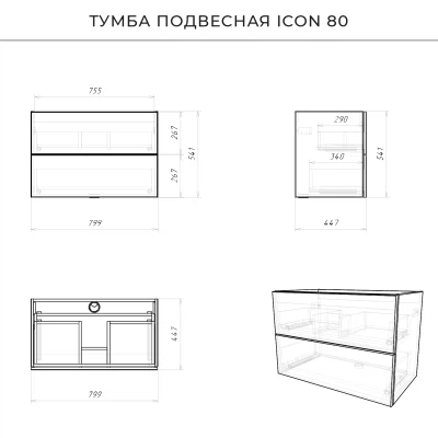 Подвесная тумба под раковину в ванную комнату из коллекции Icon - это сочетание современной стилистики и богатого функционала. Навесной способ установки тумбы в ванную дает возможность не только визуально увеличить пространство, но и обеспечивает быстрый и удобный доступ для уборки. Размеры подвесной тумбы под раковину 796х443х541 - идеальный выбор для ванной комнаты или туалета. Качественная фурнитура с доводчиками обеспечивает легкое открывание и плавное закрывание ящиков. Тумба под раковину с двумя ящиками, где можно рационально распределить и разместить все необходимые вещи для ванной комнаты. Вырез под сифон универсальный, для любого типа сифона. Для точного выбора тумбы под раковину в ванную комнату рекомендуем обратиться к схеме замеров, которая находится на фото в карточке товара, размеры изделия могут отличаться +/-1 см в связи со спецификой производства. Тумба под раковину для ванной доставляется в предварительно собранном виде, надежно упакована.