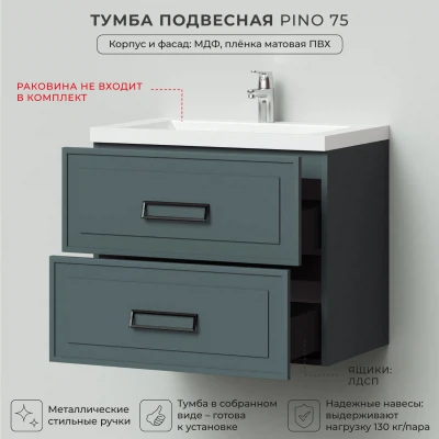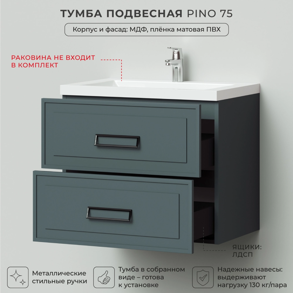 Тумба под раковину в ванную Итана из коллекции Pino. Размеры подвесной тумбы с раковиной 739х471х600 - идеальный выбор для ванной комнаты или туалета. Подвесная конструкция тумбы под раковину позволяет сэкономить место на полу и визуально расширяет пространство. Тумба под раковину в ванную подвесная выполнена из МФД и покрыта пленкой ПВХ, что гарантирует долговечность эксплуатации и износостойкость. Качественная фурнитура с доводчиками обеспечивает легкое открывание и плавное закрывание ящиков. Тумба под раковину с двумя ящиками, где можно рационально распределить и разместить все необходимые вещи для ванной комнаты. Для точного выбора тумбы рекомендуем обратиться к схеме замеров, которая находится на фото в карточке товара. Размеры изделия могут отличаться +/-1 см в связи со спецификой производства. Подвесная тумба под раковину приходит в надежной упаковке и в собранном виде.