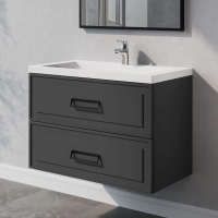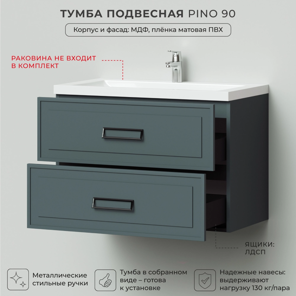 Тумба под раковину в ванную Итана из коллекции Pino. Размеры подвесной тумбы под раковину 901х480х600 - идеальный выбор для ванной комнаты или туалета. Подвесная конструкция тумбы под раковину позволяет сэкономить место на полу и визуально расширяет пространство. Тумба под раковину в ванную подвесная выполнена из МФД и покрыта пленкой ПВХ, что гарантирует долговечность эксплуатации и износостойкость. Качественная фурнитура с доводчиками обеспечивает легкое открывание и плавное закрывание ящиков. Тумба под раковину с двумя ящиками, где можно рационально распределить и разместить все необходимые вещи для ванной комнаты. Для точного выбора тумбы рекомендуем обратиться к схеме замеров, которая находится на фото в карточке товара. Размеры изделия могут отличаться +/-1 см в связи со спецификой производства. Подвесная тумба под раковину приходит в надежной упаковке и в собранном виде.