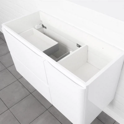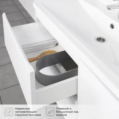 Подвесная тумба под раковину в ванную из коллекции Roberto - это сочетание современной стилистики и богатого функционала. Тумба для ванны изготовлена из прочного МДФ, поэтому выдерживает высокие эксплуатационные нагрузк и обеспечивает дополнительную защиту тумбы под раковину от влаги и перепадов температуры. Качественная фурнитура с доводчиками обеспечивает легкое открывание и плавное закрывание ящиков. Вырез под сифон универсальный, для любого типа. Благодаря своей конструкции тумба обеспечивает удобный доступ к раковине и позволяет скрыть коммуникации. Тумба под раковину в ванную оснащена удобным ящиком для хранения, что позволяет разместить всё необходимое под рукой. Ручки интегрированы в фасад, что исключает возможность случайного удара о фурнитуру. Для точного выбора тумбы под раковину в ванную комнату рекомендуем обратиться к схеме замеров, которая находится на фото в карточке товара, размеры изделия могут отличаться +/-1 см в связи со спецификой производства. Тумба для ванной доставляется в предварительно собранном виде, надежно упакована.