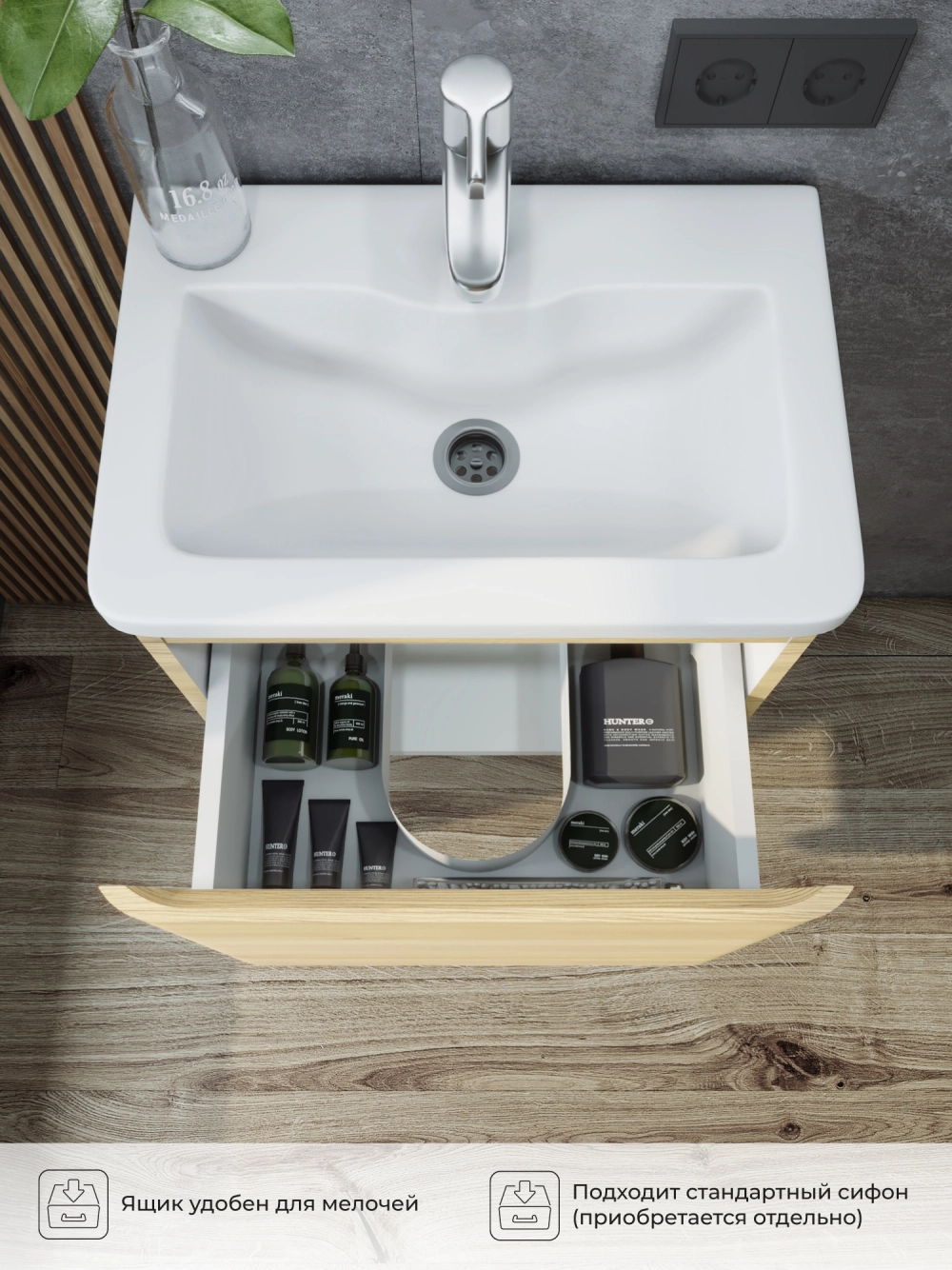 Подвесная тумба под раковину в ванную из коллекции Roberto - это сочетание современной стилистики и богатого функционала. Тумба для ванны изготовлена из прочного МДФ, поэтому выдерживает высокие эксплуатационные нагрузки. Корпус и фасады тумбы для ванной покрыты пленкой, что обеспечивает дополнительную защиту тумбы под раковину от влаги и перепадов температуры. Качественная фурнитура с доводчиками обеспечивает легкое открывание и плавное закрывание ящиков. Вырез под сифон универсальный, для любого типа. Благодаря своей конструкции тумба обеспечивает удобный доступ к раковине и позволяет скрыть коммуникации. Тумба под раковину в ванную оснащена удобным ящиком для хранения, что позволяет разместить всё необходимое под рукой. Ручки интегрированы в фасад, что исключает возможность случайного удара о фурнитуру. Для точного выбора тумбы под раковину в ванную комнату рекомендуем обратиться к схеме замеров, которая находится на фото в карточке товара, размеры изделия могут отличаться +/-1 см в связи со спецификой производства. Тумба для ванной доставляется в предварительно собранном виде, надежно упакована.