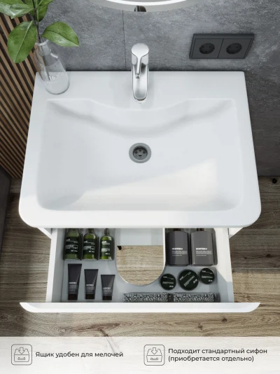 Подвесная тумба под раковину в ванную из коллекции Roberto - это сочетание современной стилистики и богатого функционала. Тумба для ванны изготовлена из прочного МДФ, поэтому выдерживает высокие эксплуатационные нагрузки и обеспечивает дополнительную защиту тумбы под раковину от влаги и перепадов температуры. Качественная фурнитура с доводчиками обеспечивает легкое открывание и плавное закрывание ящиков. Вырез под сифон универсальный, для любого типа. Благодаря своей конструкции тумба обеспечивает удобный доступ к раковине и позволяет скрыть коммуникации. Тумба под раковину в ванную оснащена двумя удобными ящиками для хранения, что позволяет разместить всё необходимое под рукой. Ручки интегрированы в фасад, что исключает возможность случайного удара о фурнитуру. Для точного выбора тумбы под раковину в ванную комнату рекомендуем обратиться к схеме замеров, которая находится на фото в карточке товара, размеры изделия могут отличаться +/-1 см в связи со спецификой производства. Тумба для ванной доставляется в предварительно собранном виде, надежно упакована.