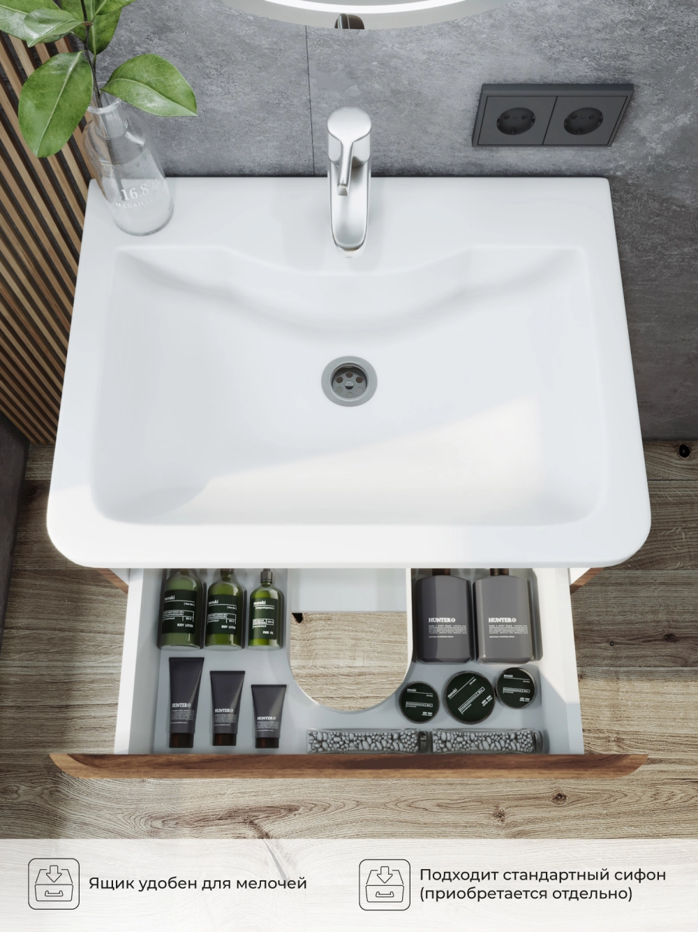 Подвесная тумба под раковину в ванную из коллекции Roberto - это сочетание современной стилистики и богатого функционала. Тумба для ванны изготовлена из прочного МДФ, поэтому выдерживает высокие эксплуатационные нагрузки и обеспечивает дополнительную защиту тумбы под раковину от влаги и перепадов температуры. Качественная фурнитура с доводчиками обеспечивает легкое открывание и плавное закрывание ящиков. Вырез под сифон универсальный, для любого типа. Благодаря своей конструкции тумба обеспечивает удобный доступ к раковине и позволяет скрыть коммуникации. Тумба под раковину в ванную оснащена двумя удобными ящиками для хранения, что позволяет разместить всё необходимое под рукой. Ручки интегрированы в фасад, что исключает возможность случайного удара о фурнитуру. Для точного выбора тумбы под раковину в ванную комнату рекомендуем обратиться к схеме замеров, которая находится на фото в карточке товара, размеры изделия могут отличаться +/-1 см в связи со спецификой производства. Тумба для ванной доставляется в предварительно собранном виде, надежно упакована.