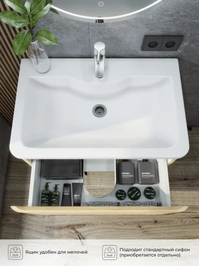 Подвесная тумба под раковину в ванную из коллекции Roberto - это сочетание современной стилистики и богатого функционала. Тумба для ванны изготовлена из прочного МДФ, поэтому выдерживает высокие эксплуатационные нагрузки и обеспечивает дополнительную защиту тумбы под раковину от влаги и перепадов температуры. Качественная фурнитура с доводчиками обеспечивает легкое открывание и плавное закрывание ящиков. Вырез под сифон универсальный, для любого типа. Благодаря своей конструкции тумба обеспечивает удобный доступ к раковине и позволяет скрыть коммуникации. Тумба под раковину в ванную оснащена удобным ящиком для хранения, что позволяет разместить всё необходимое под рукой. Ручки интегрированы в фасад, что исключает возможность случайного удара о фурнитуру. Для точного выбора тумбы под раковину в ванную комнату рекомендуем обратиться к схеме замеров, которая находится на фото в карточке товара, размеры изделия могут отличаться +/-1 см в связи со спецификой производства. Тумба для ванной доставляется в предварительно собранном виде, надежно упакована.