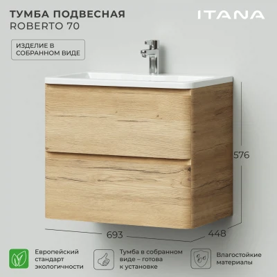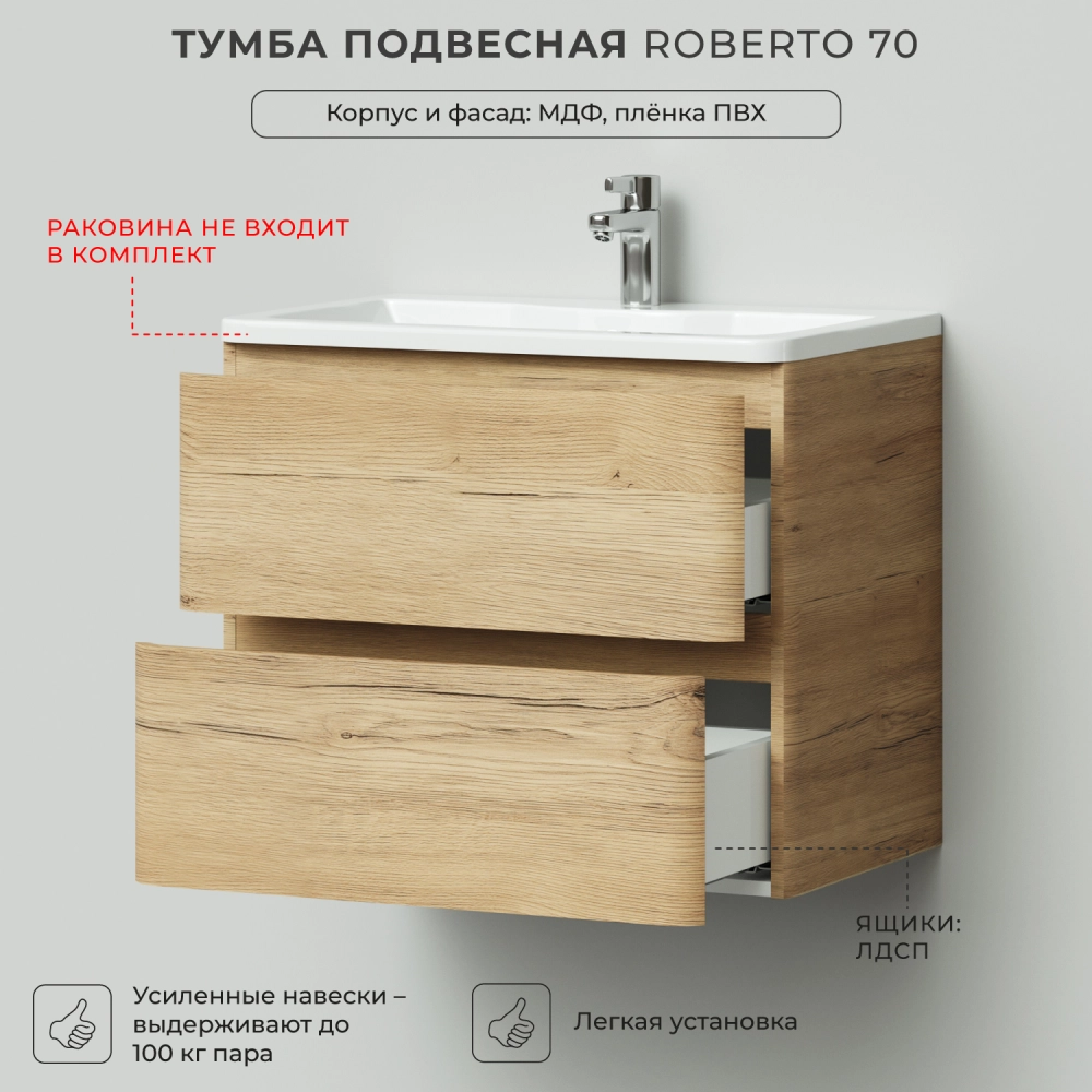Тумба под раковину подвесная Итана Roberto 70 с выдвижными ящиками Дуб Мавелла Голд