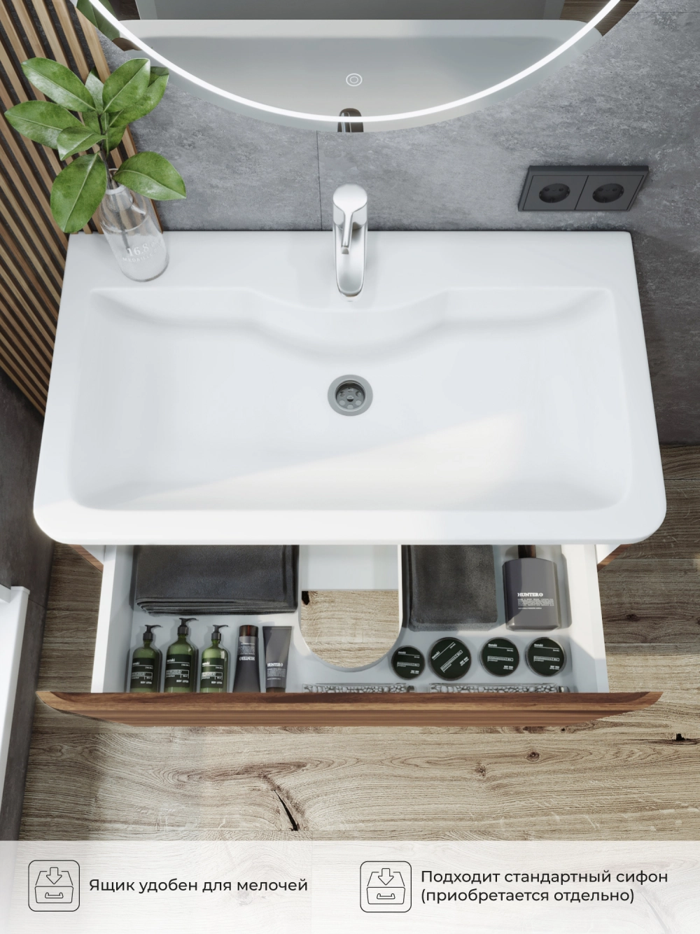Подвесная тумба под раковину в ванную из коллекции Roberto - это сочетание современной стилистики и богатого функционала. Тумба для ванны изготовлена из прочного МДФ, поэтому выдерживает высокие эксплуатационные нагрузк и обеспечивает дополнительную защиту тумбы под раковину от влаги и перепадов температуры. Качественная фурнитура с доводчиками обеспечивает легкое открывание и плавное закрывание ящиков. Вырез под сифон универсальный, для любого типа. Благодаря своей конструкции тумба обеспечивает удобный доступ к раковине и позволяет скрыть коммуникации. Тумба под раковину в ванную оснащена удобным ящиком для хранения, что позволяет разместить всё необходимое под рукой. Ручки интегрированы в фасад, что исключает возможность случайного удара о фурнитуру. Для точного выбора тумбы под раковину в ванную комнату рекомендуем обратиться к схеме замеров, которая находится на фото в карточке товара, размеры изделия могут отличаться +/-1 см в связи со спецификой производства. Тумба для ванной доставляется в предварительно собранном виде, надежно упакована.