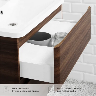 Подвесная тумба под раковину в ванную из коллекции Roberto - это сочетание современной стилистики и богатого функционала. Тумба для ванны изготовлена из прочного МДФ, поэтому выдерживает высокие эксплуатационные нагрузк и обеспечивает дополнительную защиту тумбы под раковину от влаги и перепадов температуры. Качественная фурнитура с доводчиками обеспечивает легкое открывание и плавное закрывание ящиков. Вырез под сифон универсальный, для любого типа. Благодаря своей конструкции тумба обеспечивает удобный доступ к раковине и позволяет скрыть коммуникации. Тумба под раковину в ванную оснащена удобным ящиком для хранения, что позволяет разместить всё необходимое под рукой. Ручки интегрированы в фасад, что исключает возможность случайного удара о фурнитуру. Для точного выбора тумбы под раковину в ванную комнату рекомендуем обратиться к схеме замеров, которая находится на фото в карточке товара, размеры изделия могут отличаться +/-1 см в связи со спецификой производства. Тумба для ванной доставляется в предварительно собранном виде, надежно упакована.