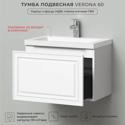 Подвесная тумба под раковину из коллекции Verona станет настоящим украшением ванной комнаты в современном скандинавском стиле. Навесной способ установки тумбы в ванную дает возможность не только визуально увеличить пространство, но и обеспечивает быстрый и удобный доступ для уборки. Размеры подвесной тумбы под раковину 597х376х400 - идеальный выбор для ванной комнаты или туалета. Тумба для ванны изготовлена из прочного МДФ, поэтому выдерживает высокие эксплуатационные нагрузки. Корпус и фасады тумбы для ванной покрыты матовой пленкой, что обеспечивает дополнительную защиту тумбы под раковину от влаги и перепадов температуры. Качественная фурнитура с доводчиками обеспечивает легкое открывание и плавное закрывание ящика. Вырез под сифон универсальный, для любого типа. Благодаря своей конструкции тумба в ванную обеспечивает удобный доступ к раковине и позволяет скрыть коммуникации. Тумба под раковину в ванную оснащена удобным ящиком для хранения, что позволяет разместить всё необходимое под рукой. Ручки интегрированы в фасад дверки шкафчика, что исключает возможность случайного удара о фурнитуру. Для точного выбора подвесной тумбы под раковину в ванную комнату рекомендуем обратиться к схеме замеров, которая находится на фото в карточке товара, размеры изделия могут отличаться +/-1 см в связи со спецификой производства. Тумба для ванной доставляется в предварительно собранном виде, надежно упакована.