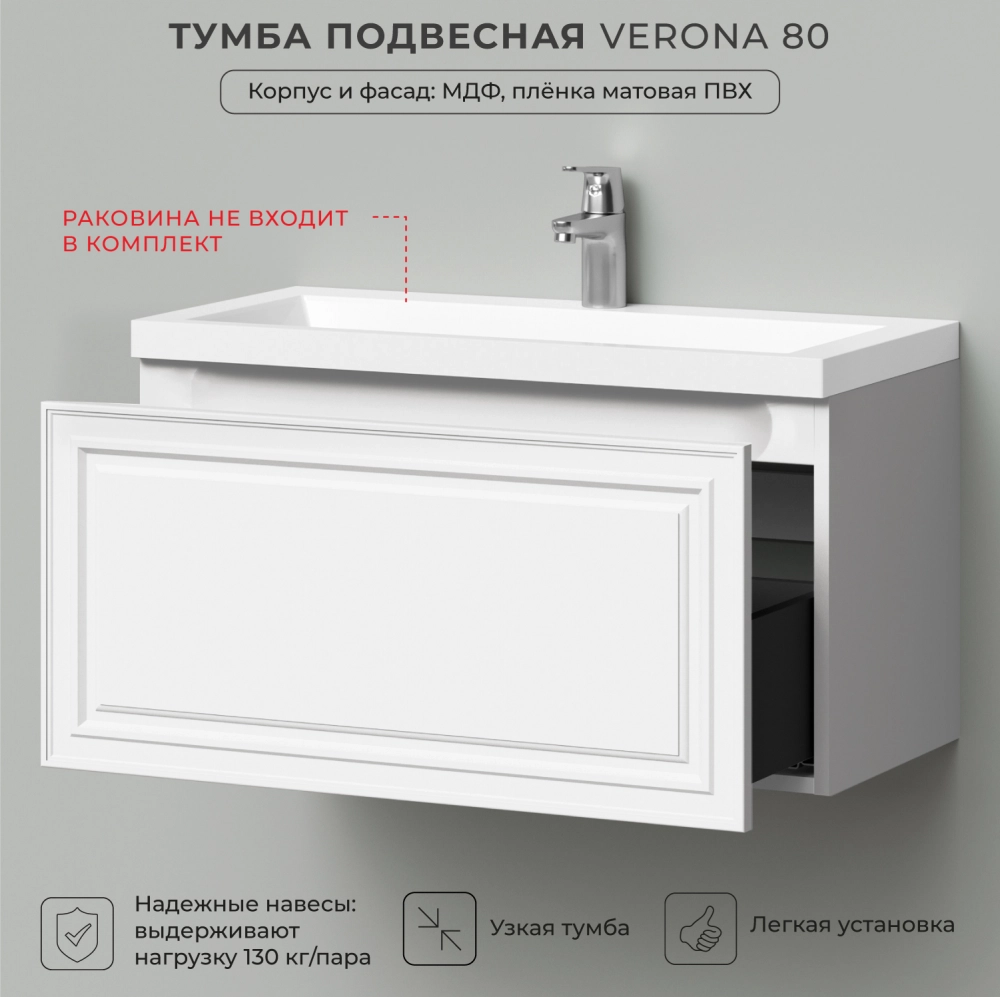 Подвесная тумба под раковину из коллекции Verona станет настоящим украшением ванной комнаты в современном скандинавском стиле. Навесной способ установки тумбы в ванную дает возможность не только визуально увеличить пространство, но и обеспечивает быстрый и удобный доступ для уборки. Размеры подвесной тумбы под раковину 790х376х400 - идеальный выбор для ванной комнаты или туалета. Тумба для ванны изготовлена из прочного МДФ, поэтому выдерживает высокие эксплуатационные нагрузки и обеспечивает дополнительную защиту тумбы под раковину от влаги и перепадов температуры. Качественная фурнитура с доводчиками обеспечивает легкое открывание и плавное закрывание ящика. Вырез под сифон универсальный, для любого типа. Благодаря своей конструкции тумба в ванную обеспечивает удобный доступ к раковине и позволяет скрыть коммуникации. Тумба под раковину в ванную оснащена удобным ящиком для хранения, что позволяет разместить всё необходимое под рукой. Ручки интегрированы в фасад дверки шкафчика, что исключает возможность случайного удара о фурнитуру. Для точного выбора подвесной тумбы под раковину в ванную комнату рекомендуем обратиться к схеме замеров, которая находится на фото в карточке товара, размеры изделия могут отличаться +/-1 см в связи со спецификой производства. Тумба для ванной доставляется в предварительно собранном виде, надежно упакована.