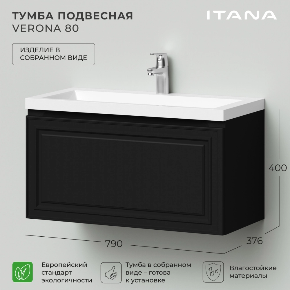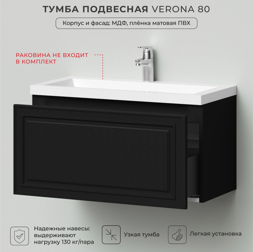 Тумба под раковину подвесная Итана Verona 80 с выдвижным ящиком Черный софт