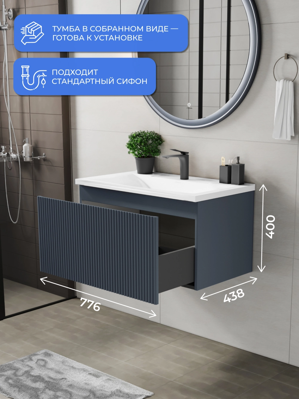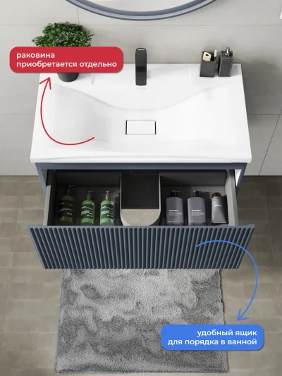 Подвесная тумба под раковину Итана Kate 80 станет идеальным дополнением для вашей ванной комнаты, сочетая в себе стильный дизайн и функциональность. Коллекция Kate - воплотила в себе тренд на фактурные фасады. Идеальный "рубчик" - простое и стильное дизайнерское решение для декорирования фасадов - эта мебель бесспорно станет украшением современной ванной комнаты. Элегантная подвесная конструкция позволяет максимально эффективно использовать пространство, создавая ощущение легкости и визуальной свободы в интерьере. Тумба изготовлена из высококачественных материалов, гарантируя долговечность и надежность эксплуатации. Удобные фрезерованные ручки, качественная фурнитура с доводчиками, вместительность - мы продумали все, чтобы тумба под раковину была не просто красивой, но еще и функциональной, приятной в использовании. Ее конструкция позволяет легко поддерживать порядок в ванной, ведь все мелочи будут аккуратно убраны. Стильный декор тумбы добавляет изюминку в общий дизайн, вписываясь в современные и классические интерьеры. Удобные выдвижные ящики обеспечивают простоту доступа к содержимому тумбы. Подвесная тумба для ванной Итана Kate 80 — это также безопасность и удобство в уборке, так как свободное пространство под ней позволяет легко очистить пол. Безупречное сочетание раковины с тумбой подчеркивает общий стиль вашей ванной комнаты, делая ее уютной и функциональной. Для точного выбора тумбочки в ванную комнату рекомендуем обратиться к схеме замеров, которая находится на фото в карточке товара, размеры изделия могут отличаться +/-1 см в связи со спецификой производства. Тумба для ванной доставляется в предварительно собранном виде, надежно упакована.