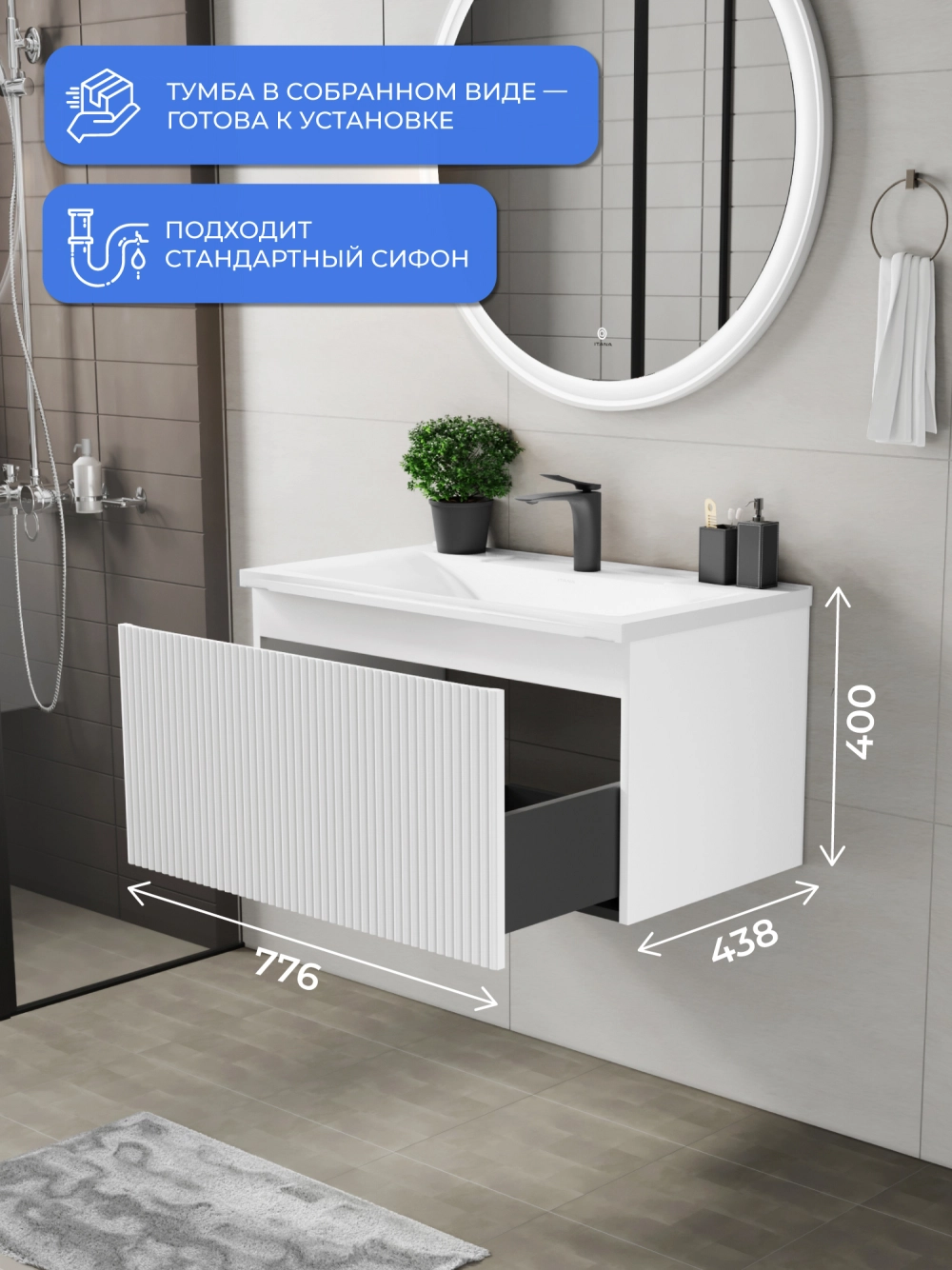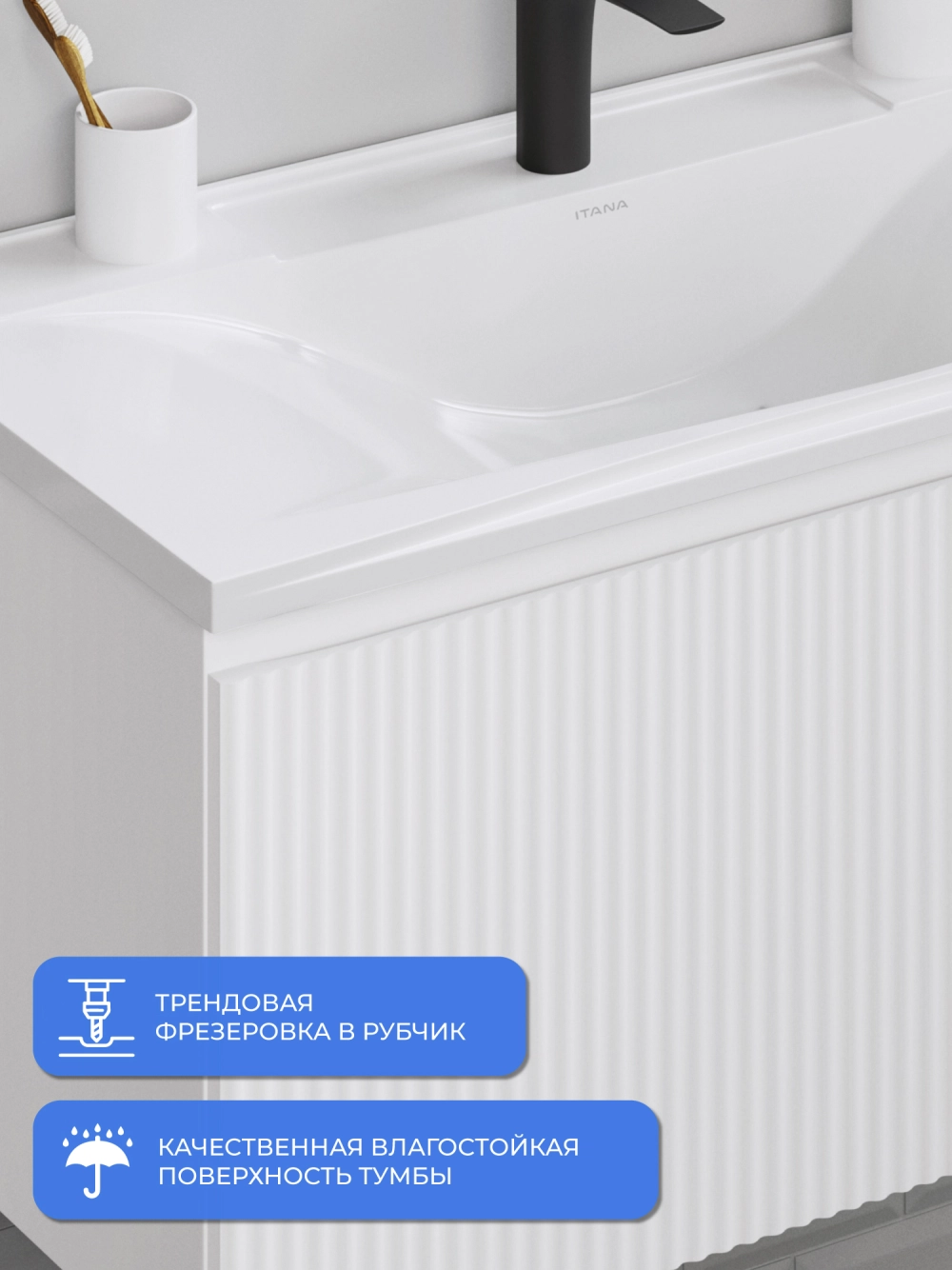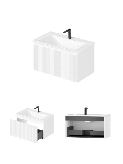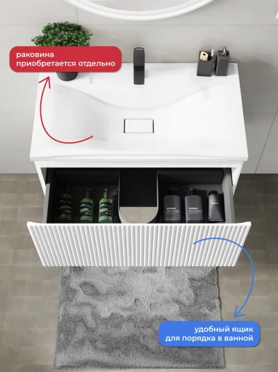 Подвесная тумба под раковину Итана Kate 80 станет идеальным дополнением для вашей ванной комнаты, сочетая в себе стильный дизайн и функциональность. Коллекция Kate - воплотила в себе тренд на фактурные фасады. Идеальный "рубчик" - простое и стильное дизайнерское решение для декорирования фасадов - эта мебель бесспорно станет украшением современной ванной комнаты. Элегантная подвесная конструкция позволяет максимально эффективно использовать пространство, создавая ощущение легкости и визуальной свободы в интерьере. Тумба изготовлена из высококачественных материалов, гарантируя долговечность и надежность эксплуатации. Удобные фрезерованные ручки, качественная фурнитура с доводчиками, вместительность - мы продумали все, чтобы тумба под раковину была не просто красивой, но еще и функциональной, приятной в использовании. Ее конструкция позволяет легко поддерживать порядок в ванной, ведь все мелочи будут аккуратно убраны. Стильный декор тумбы добавляет изюминку в общий дизайн, вписываясь в современные и классические интерьеры. Удобные выдвижные ящики обеспечивают простоту доступа к содержимому тумбы. Подвесная тумба для ванной Итана Kate 80 — это также безопасность и удобство в уборке, так как свободное пространство под ней позволяет легко очистить пол. Безупречное сочетание раковины с тумбой подчеркивает общий стиль вашей ванной комнаты, делая ее уютной и функциональной. Для точного выбора тумбочки в ванную комнату рекомендуем обратиться к схеме замеров, которая находится на фото в карточке товара, размеры изделия могут отличаться +/-1 см в связи со спецификой производства. Тумба для ванной доставляется в предварительно собранном виде, надежно упакована.