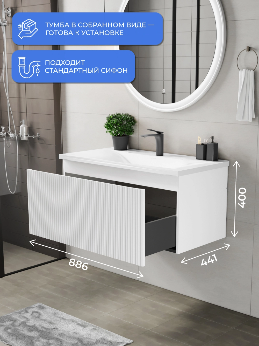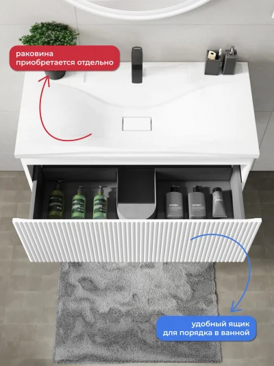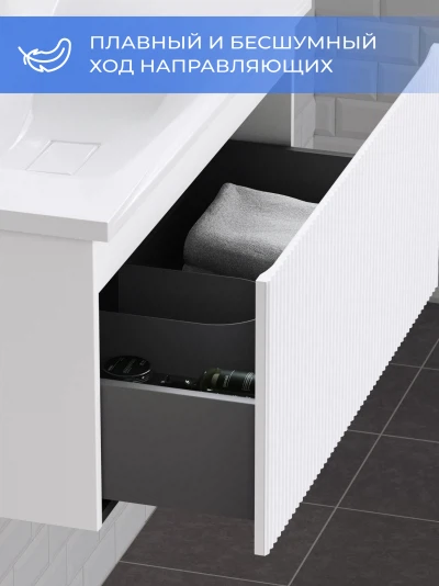 Подвесная тумба под раковину Итана Kate 90 станет идеальным дополнением для вашей ванной комнаты, сочетая в себе стильный дизайн и функциональность. Коллекция Kate - воплотила в себе тренд на фактурные фасады. Идеальный "рубчик" - простое и стильное дизайнерское решение для декорирования фасадов - эта мебель бесспорно станет украшением современной ванной комнаты. Элегантная подвесная конструкция позволяет максимально эффективно использовать пространство, создавая ощущение легкости и визуальной свободы в интерьере. Тумба изготовлена из высококачественных материалов, гарантируя долговечность и надежность эксплуатации. Удобные фрезерованные ручки, качественная фурнитура с доводчиками, вместительность - мы продумали все, чтобы тумба под раковину была не просто красивой, но еще и функциональной, приятной в использовании. Ее конструкция позволяет легко поддерживать порядок в ванной, ведь все мелочи будут аккуратно убраны. Стильный декор тумбы добавляет изюминку в общий дизайн, вписываясь в современные и классические интерьеры. Удобные выдвижные ящики обеспечивают простоту доступа к содержимому тумбы. Подвесная тумба для ванной Итана Kate 90 — это также безопасность и удобство в уборке, так как свободное пространство под ней позволяет легко очистить пол. Безупречное сочетание раковины с тумбой подчеркивает общий стиль вашей ванной комнаты, делая ее уютной и функциональной. Для точного выбора тумбочки в ванную комнату рекомендуем обратиться к схеме замеров, которая находится на фото в карточке товара, размеры изделия могут отличаться +/-1 см в связи со спецификой производства. Тумба для ванной доставляется в предварительно собранном виде, надежно упакована.
