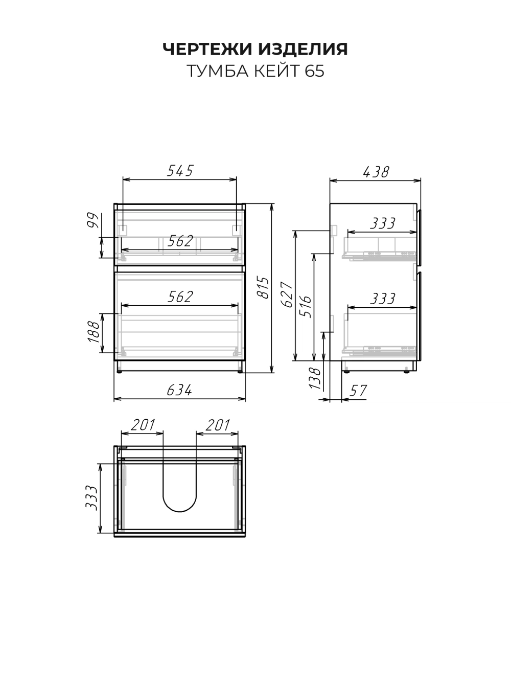 Тумба под раковину подвесная ИТАНА Кейт 65 с выдвижными ящиками Светло-серый